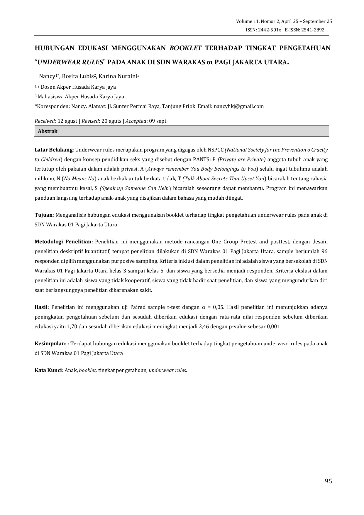 JURNAL AKADEMI KEPERAWATAN HUSADA KARYA JAYAJURNAL AKADEMI KEPERAWATAN HUSADA KARYA JAYALatar Belakang: Underwear rules merupakan program yang digagas oleh NSPCC (National Society for the Prevention of Cruelty to Children) dengan konsep pendidikan seks yang disebut dengan PANTS: P (Private are Private) anggota tubuh anak yang tertutup oleh pakaian dalam adalah privasi, A (Always remember You Body Belongings to You) selalu ingat tubuhmu adalah milikmu, N (No Means No) anak berhak untuk berkata tidak, T (Talk About Secrets That Upset You) bicaralah tentang rahasia yang membuatmu kesal, S (Speak up Someone Can Help) bicaralah seseorang dapat membantu. Program ini menawarkan panduan langsung terhadap anak-anak yang disajikan dalam bahasa yang mudah diingat.. . Tujuan: Menganalisis .. . Metodologi Penelitian: Penelitian ini menggunakan metode rancangan One Group Pretest and posttest, dengan desain penelitian deskriptif kuantitatif, tempat penelitian dilakukan di SDN Warakas 01 Pagi Jakarta Utara, sample berjumlah 96 responden dipilih menggunakan purposive sampling. Kriteria inklusi dalam penelitian ini adalah siswa yang bersekolah di SDN Warakas 01 Pagi Jakarta Utara kelas 3 sampai kelas 5, dan siswa yang bersedia menjadi responden. Kriteria ekslusi dalam penelitian ini adalah siswa yang tidak kooperatif, siswa yang tidak hadir saat penelitian, dan siswa yang mengundurkan diri saat berlangsungnya penelitian dikarenakan sakit.