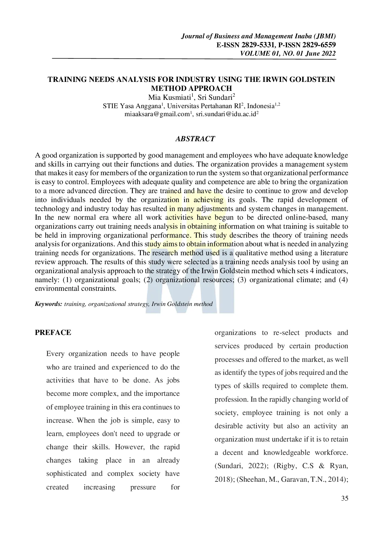Journal of Business and Management InabaJournal of Business and Management InabaA good organization is supported by good management and employees who have adequate knowledge and skills in carrying out their functions and duties. The organization provides a management system that makes it easy for members of the organization to run the system so that organizational performance is easy to control. Employees with adequate quality and competence are able to bring the organization to a more advanced direction. They are trained and have the desire to continue to grow and develop into individuals needed by the organization in achieving its goals. The rapid development of technology and industry today has resulted in many adjustments and system changes in management. In the new normal era where all work activities have begun to be directed online-based, many organizations carry out training needs analysis in obtaining information on what training is suitable to be held in improving organizational performance. This study describes the theory of training needs analysis for organizations. And this study aims to obtain information about what is needed in analyzing training needs for organizations. The research method used is a qualitative method using a literature review approach. The results of this study were selected as a training needs analysis tool by using an organizational analysis approach to the strategy of the Irwin Goldstein method which sets 4 indicators, namely: (1) organizational goals; (2) organizational resources; (3) organizational climate; and (4) environmental constraints.