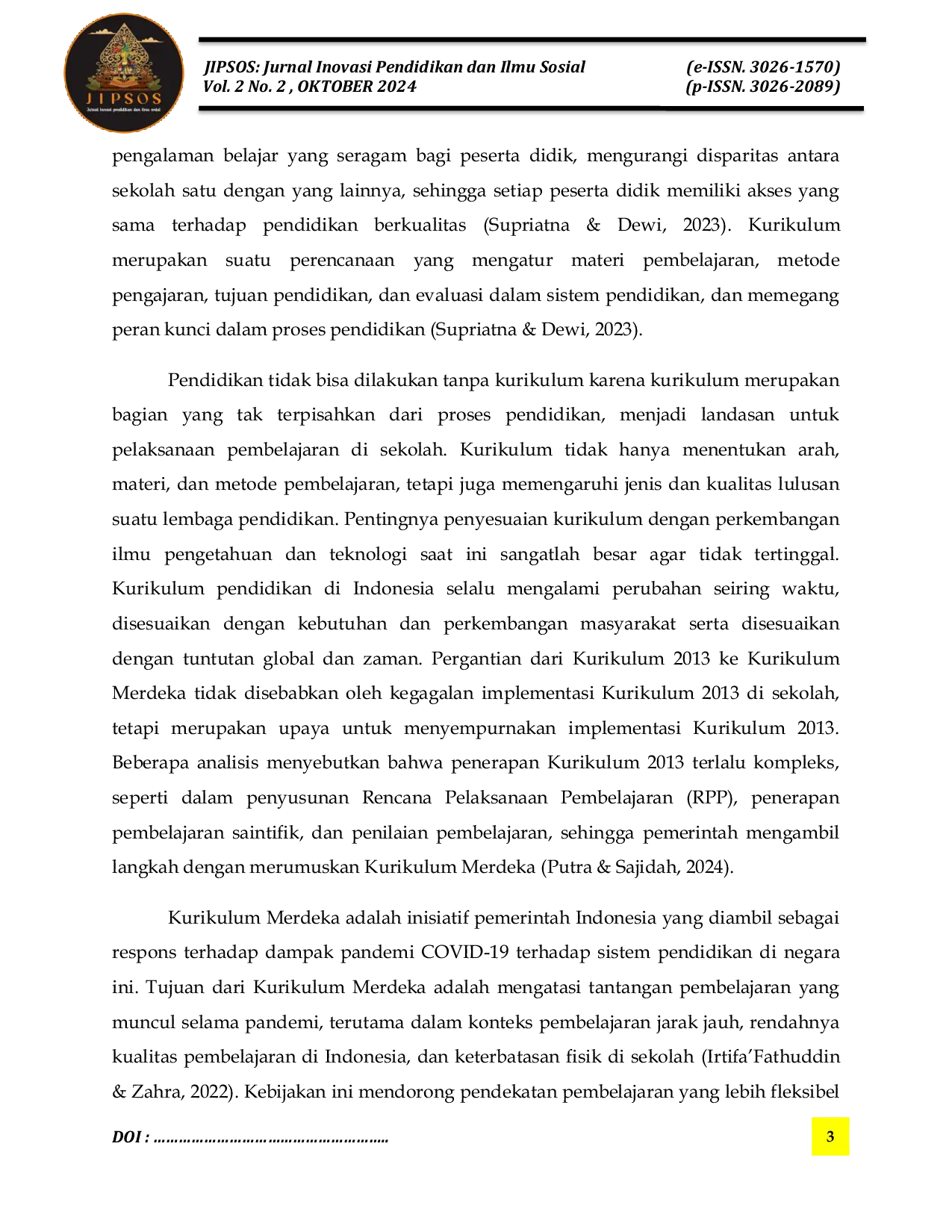 Jurnal Inovasi Pendidikan dan Ilmu SosialJurnal Inovasi Pendidikan dan Ilmu SosialTujuan penelitian ini adalah untuk menganalisis komperasi kurikulum Merdeka dan K13 di MTsN 2 Sidoarjo. Penelitian ini merupakan penelitian deskriptif kualitatif yang menggunakan metode studi kasus. Berdasakan hasil analisis, Kurikulum 2013 dengan kepadatan materi yang tinggi, tidak lagi relevan untuk diterapkan dalam konteks saat ini. Oleh karena itu, Pendidikan Indonesia memerlukan penyesuaian dalam berbagai aspek agar tetap mencapai tujuan nasional Pendidikan. Sebaliknya, Kurikulum Merdeka lebih berfokus pada materi esensial dan pengembangan kompetensi peserta didik sesuai dengan tahap perkembangannya. Hal ini bertujuan agar pembelajaran tidak terburu-buru dalam menyelesaikan materi sehingga peserta didik dapat merasakan kepuasan dalam proses belajar yang bermakna. Salah satu aspek yang menonjol dalam implementasi Kurikulum Merdeka adalah pengembangan karakter peserta didik yang terinci dalam Projek Penguatan Profil Pelajar Pancasila (P5), hal itu lah yang di adopsi MTsN 2 Sidoarjo.