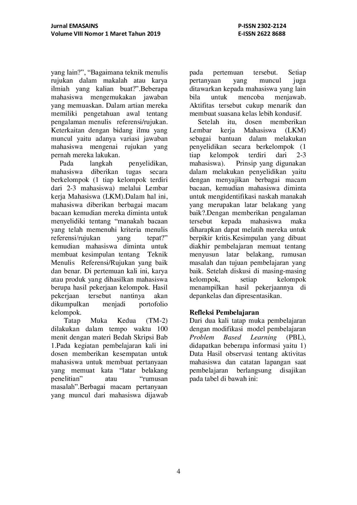 Emasains : Jurnal Edukasi Matematika dan SainsEmasains : Jurnal Edukasi Matematika dan SainsPenelitian ini menggunakan instrumen Satuan Acuan Pembelajaran, Lembar Observasi, Lembar Kerja Mahasiswa, Soal Tes, serta Catatan Lapangan. Artikel ini ingin menyajikan deskripsi hasil refleksi pembelajaran yang telah dilakukan pada mata kuliah teknik penulisan skripsi dengan harapan memberikan pengalaman belajar yang dapat melatih kemampuan berpikir kritis mahasiswa. Kesimpulan yang diambil yaitu Melalui Pembelajaran Problem Based Learning (PBL) dapat teridentifikasi kemampuan berpikir kritis mahasiswa, indikator berpikir kritis yang paling banyak dimiliki oleh mahasiswa pendidikan matematika IKIP PGRI Jember yaitu Interpretation, indikator berpikir kritis yang paling sedikit dimiliki oleh mahasiswa yaitu Recognition of assumptions.