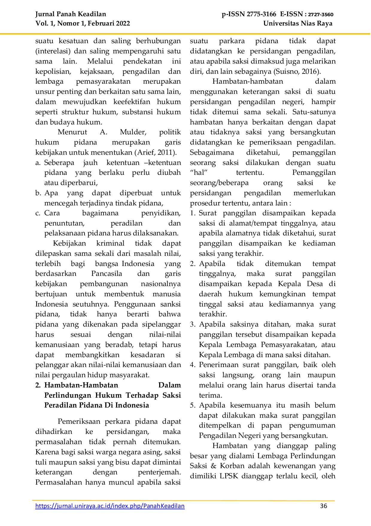 JURNAL PANAH KEADILANJURNAL PANAH KEADILANPerlindungan saksi ini dibentuk untuk memberikan rasa aman terhadap setiap saksi dalam memberikan keterangan pada setiap proses peradilan pidana. Peran saksi pada peradilan pidana di Indonesia dan hambatan dalam perlindungan hukum terhadap saksi peradilan pidana di Indonesia? Penelitian ini menggunakan metode pendekatan yuridis normatif untuk menemukan kaidah-kaidah dan norma-norma hukum dengan menggunakan data primer, sekunder dan tersier sebagai sumber data. Metode pengumpulan data menggunakan teknik studi kepustakaan. Peran saksi pada peradilan pidana di Indonesia pada umumnya, alat bukti keterangan saksi merupakan alat bukti yang paling utama dalam perkara pidana. Hambatan yang terjadi dalam perlindungan hukum ini juga lembaga perlindungan saksi yang terbentuk sejak tahun 2006 pasca diberlakukannya Undang-Undang Nomor 13 tahun 2006 belum memiliki kekuatan yang penuh dalam memberikan perlindungan hukum bagi saksi. Kerjasama lembaga perlindungan saksi dan korban dengan lembaga terkait lainnya terutama pihak kepolisian dan kejaksaan sebagai penyidik belum terjalin dengan baik sehingga perlindungan saksi belum terlaksana secara komprehensif.