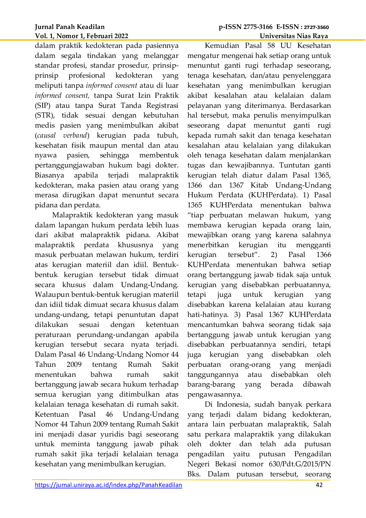 JURNAL PANAH KEADILANJURNAL PANAH KEADILANKarya ilmiah ini ditulis dengan tujuan untuk memahami dan mengetahui dari perspektif yuridis sejauh mana yang ditangani yang berakibat terjadi malapraktik (Studi Putusan Nomor 1366/K/Pdt/2017). Adapun penulisan artikel ini menggunakan jenis penelitian hukum normatif yang mengkaji dari sisi peraturan perundang-undangan yang berlaku dengan metode pendekatan peraturan perundang-undangan, pendekatan kasus, dan pendekatan analisis dengan mengumpulkan data sekunder yang terdiri dari bahan hukum primer, bahan hukum sekunder, dan bahan hukum tersier. Analisis data yang digunakan yaitu analisis data kualitatif. kemudian penarikan kesimpulan dilakukan secara deduktif. Berdasarkan penelitian dan pembahasan, sesuai putusan hakim yang telah berkekuatan hukum tetap, menolak permohonan kasasi yang diajukan oleh pemohon kasasi. Berdasarkan putusan hakim tersebut penulis menganggap bahwa putusan tersebut tidak tepat, karena menuurt penulis Hakim mengabaikan ketentuan Pasal 1365, Pasal 1366, dan Pasal 1367 KUHPerdata yang memberi ruang bagi seseorang yang dirugikan untuk menuntut kerugian dari seseorang atau kelompok yang dalam hal ini pasien untuk melakukan penuntutan ganti kerugian kepada dokter dan rumah sakit akibat suatu kelalaianyang terjadi serta Pasal 58 ayat (1) Undang-Undang Nomor 36 Tahun 2009 tentang Kesehatan, yang secara tegas menyatakan bahwa setiap orang berhak menuntut ganti rugi terhadap seseorang, tenaga kesehatan, dan/atau penyelenggara kesehatan yang menimbulkan kerugian akibat kesalahan atau kelalaian dalam pelayanan kesehatan yang diterimanya.