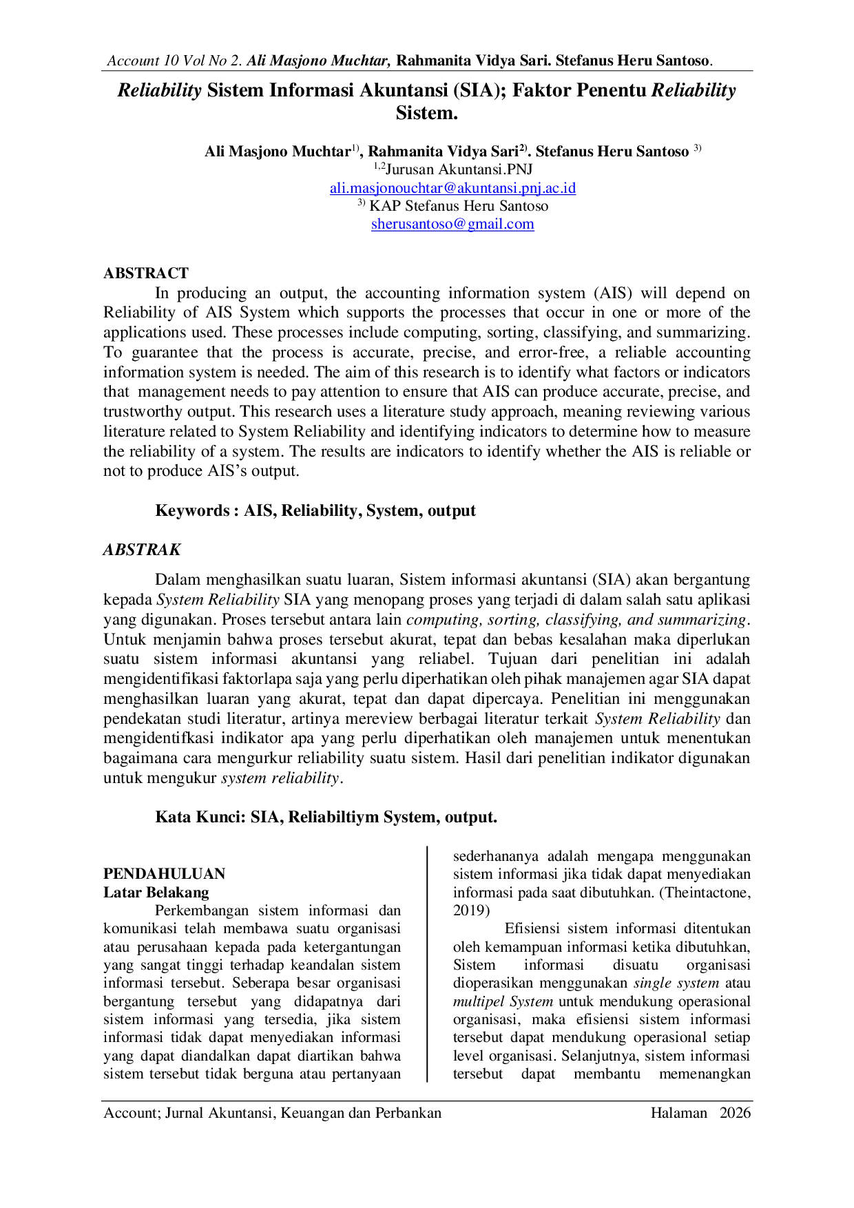 Account: Jurnal Akuntansi, Keuangan dan PerbankanAccount: Jurnal Akuntansi, Keuangan dan PerbankanDalam menghasilkan suatu luaran, Sistem Informasi Akuntansi (SIA) akan bergantung kepada System Reliability SIA yang menopang proses yang terjadi di dalam salah satu aplikasi yang digunakan. Proses tersebut antara lain computing, sorting, classifying, dan summarizing. Untuk menjamin bahwa proses tersebut akurat, tepat dan bebas kesalahan maka diperlukan suatu sistem informasi akuntansi yang reliabel. Tujuan dari penelitian ini adalah mengidentifikasi faktor apa saja yang perlu diperhatikan oleh pihak manajemen agar SIA dapat menghasilkan luaran yang akurat, tepat dan dapat dipercaya. Penelitian ini menggunakan pendekatan studi literatur, artinya mereview berbagai literatur terkait System Reliability dan mengidentifikasi indikator apa yang perlu diperhatikan oleh manajemen untuk menentukan bagaimana cara mengukur reliability suatu sistem. Hasil dari penelitian adalah indikator yang digunakan untuk mengukur system reliability.