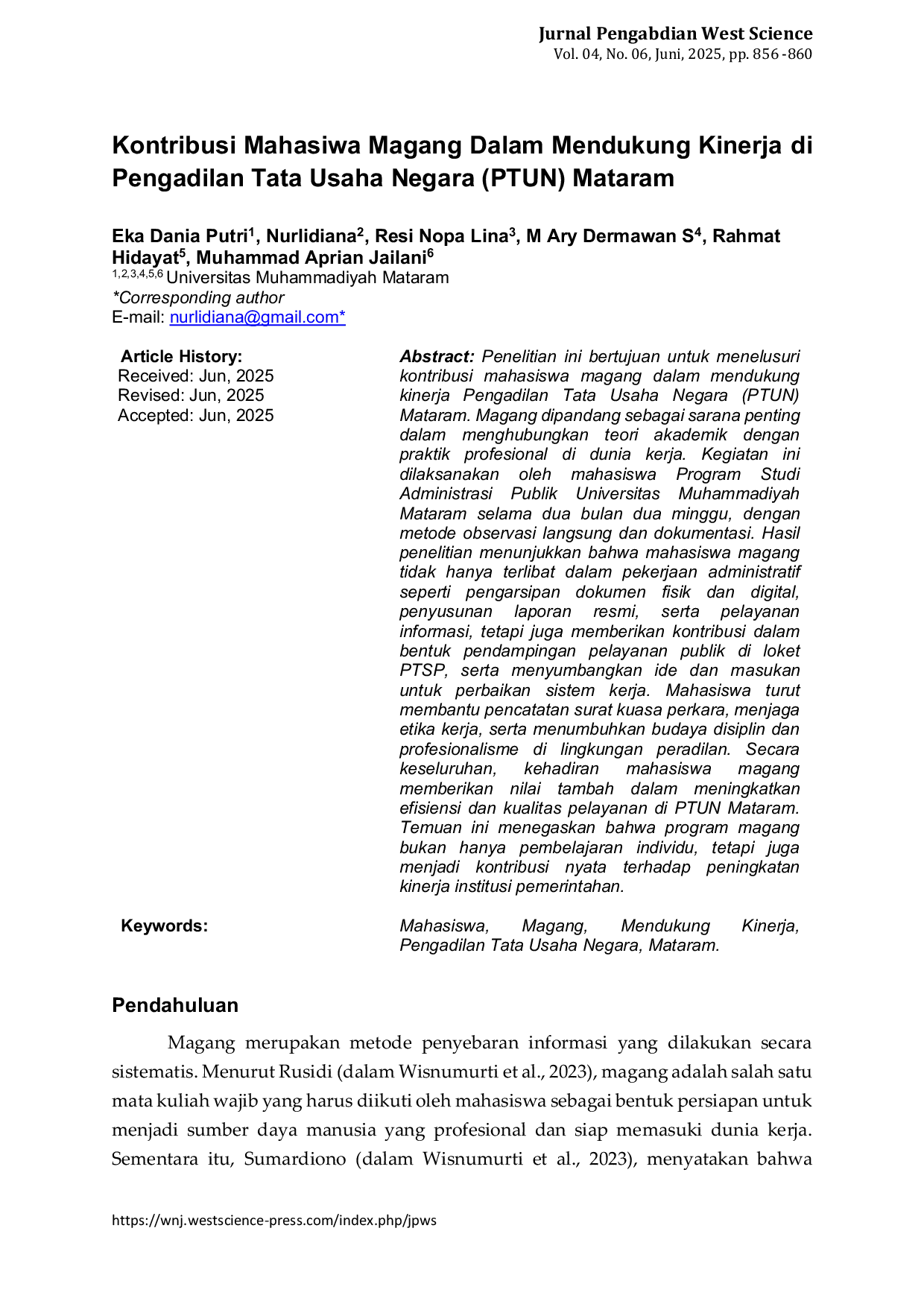 Jurnal Pengabdian West ScienceJurnal Pengabdian West SciencePenelitian ini bertujuan untuk menelusuri kontribusi mahasiswa magang dalam mendukung kinerja Pengadilan Tata Usaha Negara (PTUN) Mataram. Magang dipandang sebagai sarana penting dalam menghubungkan teori akademik dengan praktik profesional di dunia kerja. Kegiatan ini dilaksanakan oleh mahasiswa Program Studi Administrasi Publik Universitas Muhammadiyah Mataram selama dua bulan dua minggu, dengan metode observasi langsung dan dokumentasi. Hasil penelitian menunjukkan bahwa mahasiswa magang tidak hanya terlibat dalam pekerjaan administratif fisik dan digital, seperti pengarsipan dokumen resmi, serta pelayanan informasi, tetapi juga memberikan kontribusi dalam bentuk pendampingan pelayanan publik di loket PTSP, serta menyumbangkan ide dan masukan untuk perbaikan sistem kerja. Mahasiswa turut membantu pencatatan surat kuasa perkara, menjaga etika kerja, serta menumbuhkan budaya disiplin dan profesionalisme di lingkungan peradilan. Secara keseluruhan, kehadiran mahasiswa magang memberikan nilai tambah dalam meningkatkan efisiensi dan kualitas pelayanan di PTUN Mataram. Temuan ini menegaskan bahwa program magang bukan hanya pembelajaran individu, tetapi juga menjadi kontribusi nyata terhadap peningkatan kinerja institusi pemerintahan.