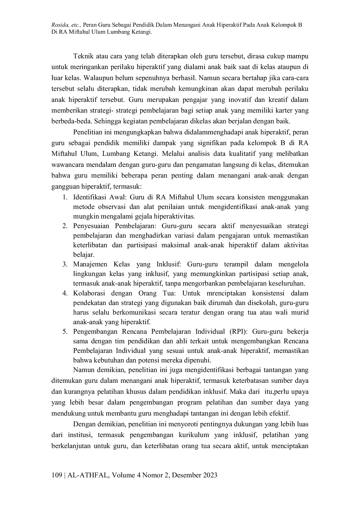 Al-ATHFAL: Jurnal Pendidikan AnakAl-ATHFAL: Jurnal Pendidikan AnakTujuan dari penelitian ini yaitu tujuan untuk mengetahui ciri-ciri anak hiperaktif dan mengetahui tugas guru sebagai pendidik dalam menangani anak hiperaktif di RA Miftahul Ulum Lumbang Ketangi.Jenis penelitian ini menggunakan penelitian deskriptif dan menggunakan pendekatan kualitatif. Untuk mengumpulkan data yang relevan di dalam penelitian ini dilakukan metode observasi, wawancara, dan dokumentasi. Sumber data yang didapatkan yakni dari guru kelas kelompok B dan siswa kelompok B sebagai subyek penelitian. Dalam penelitian ini teknik yang digunakan dalam menganalisis data yaitu melalui reduksi data, penyajian data lalu penarikan kesimpulan. Penelitian ini menghasilkan informasi bahwa: 1) Ciri-ciri anak hiperaktif ditandai dengan anak yang tidak bisa diam, tidak bisa fokur, suka berlarian kesana kemari, sering meninggalkan tempat duduknya, anak tidak sabar menunggu giliran, suka membantah. 2) peran guru dalam menangani perilaku anak hiperaktif adalahselalu memantautingkah laku anak tersebut, memberikan tugas, anak diberikan kesempatan untuk bebas melakukan permainan yang disukai namun selalu dalam pengawasan guru, memuji anak ketika anak dapat menyelesaikan tugasnya atau saat anak dapat mematuhi perintah guru, memberi hukuman ringan kepada anak jika telah melakukan suatu kesalahan, guru duduk di dekat anak atau di meja belajar anak.
