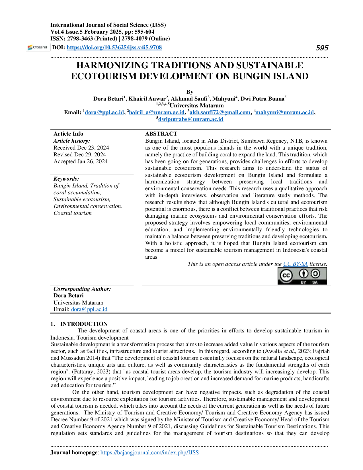 International Journal of Social ScienceInternational Journal of Social ScienceBungin Island, located in Alas District, Sumbawa Regency, NTB, is known as one of the most populous islands in the world with a unique tradition, namely the practice of building coral to expand the land. This tradition, which has been going on for generations, provides challenges in efforts to develop sustainable ecotourism. This research aims to understand the status of sustainable ecotourism development on Bungin Island and formulate a harmonization strategy between preserving traditions and environmental conservation needs. This research uses a qualitative approach with in-depth interviews, observation and literature study methods. The research results show that although Bungin Islands cultural and ecotourism potential is enormous, there is a conflict between traditional practices that risk damaging marine ecosystems and environmental conservation efforts. The proposed strategy involves empowering local communities, environmental education, and implementing environmentally friendly technologies to maintain a balance between preserving traditions and developing ecotourism. With a holistic approach, it is hoped that Bungin Island ecotourism can become a model for sustainable tourism management in Indonesias coastal areas.