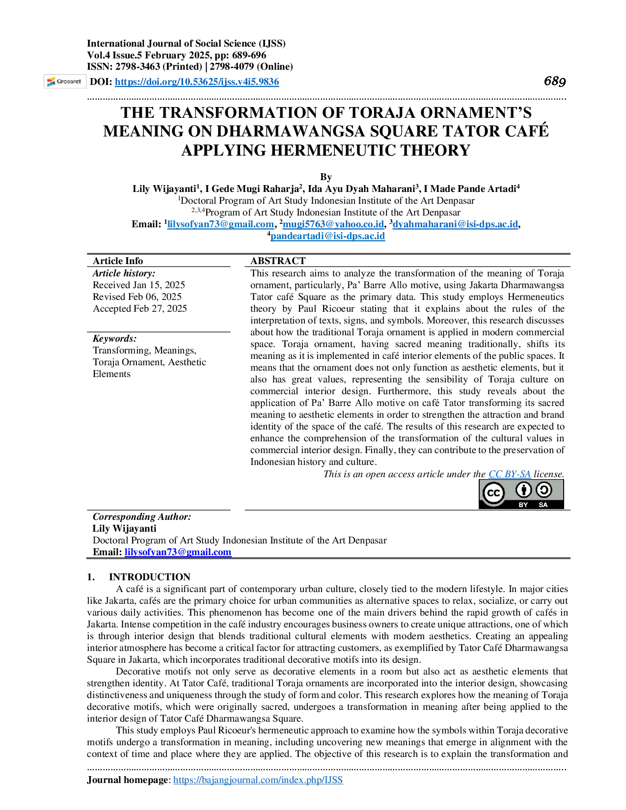 International Journal of Social ScienceInternational Journal of Social SciencePenelitian ini bertujuan menganalisis transformasi makna ornamen Toraja, khususnya motif Pa Barre Allo, menggunakan restoran Tator di Dharmawangsa Square Jakarta sebagai data utama. Studi ini menggunakan teori Hermeneutika Paul Ricoeur yang menjelaskan aturan interpretasi teks, tanda, dan simbol. Penelitian ini juga membahas bagaimana ornamen Toraja tradisional diterapkan dalam ruang komersial modern. Ornamen Toraja yang secara tradisional memiliki makna sakral berubah maknanya ketika diterapkan dalam elemen interior restoran. Ini berarti ornamen tidak hanya berfungsi sebagai elemen estetika, tetapi juga memiliki nilai besar yang merepresentasikan kesensitifan budaya Toraja dalam desain interior komersial. Selain itu, studi ini menunjukkan penerapan motif Pa Barre Allo di Tator Café yang mengubah makna sakral menjadi elemen estetika untuk memperkuat daya tarik dan identitas merek ruang café. Hasil penelitian ini diharapkan meningkatkan pemahaman tentang transformasi nilai budaya dalam desain interior komersial. Akhirnya, mereka dapat berkontribusi pada pelestarian sejarah dan budaya Indonesia.