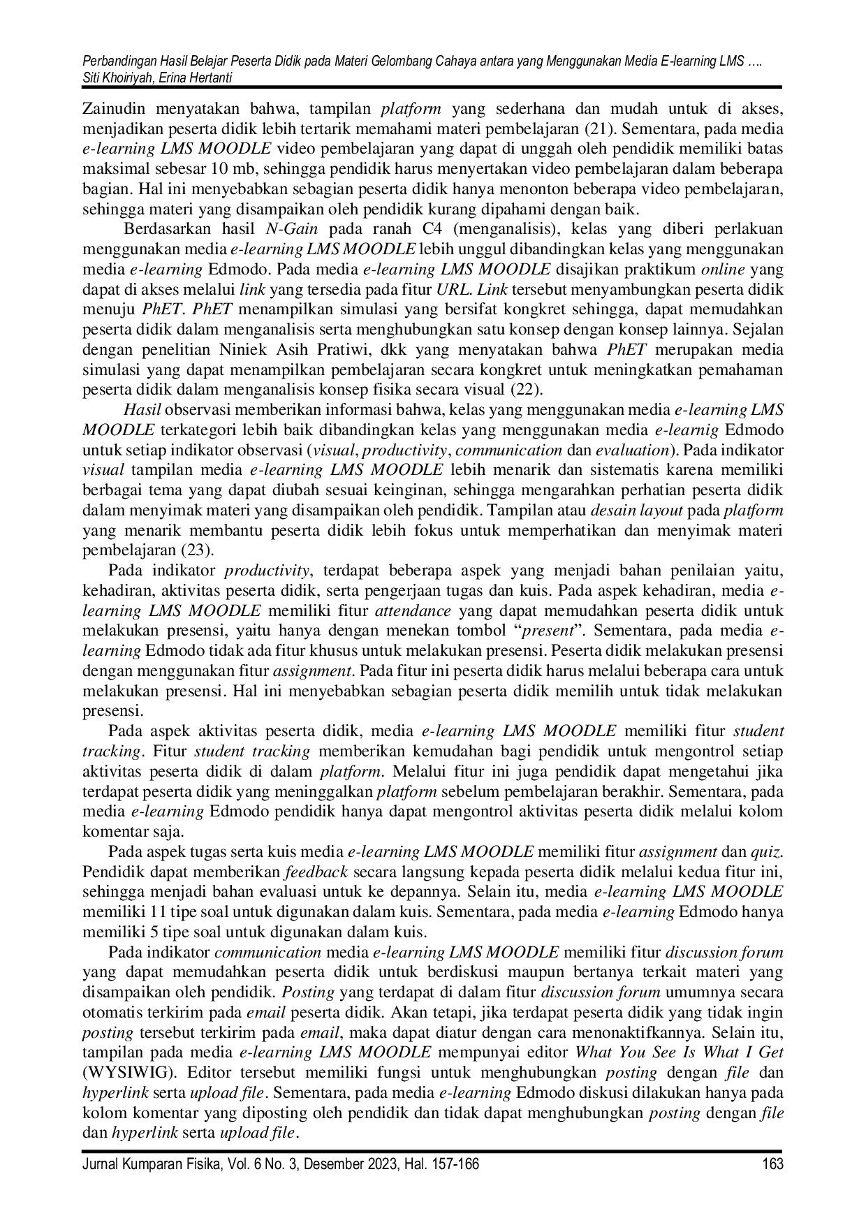 Terdapat perbedaan hasil belajar peserta didik pada materi gelombang cahaya antara yang menggunakan media e-learning LMS MOODLE dan Edmodo, berdasarkan nilai signifikansi 0,001 < 0,05.Kelas yang menggunakan media e-learning LMS MOODLE menunjukkan peningkatan hasil belajar lebih baik dibandingkan kelas yang menggunakan Edmodo, terutama pada ranah kognitif C1 dan C4.Hasil observasi menyatakan bahwa kelas dengan LMS MOODLE terkategori baik secara keseluruhan, sedangkan kelas dengan Edmodo terkategori cukup baik.
