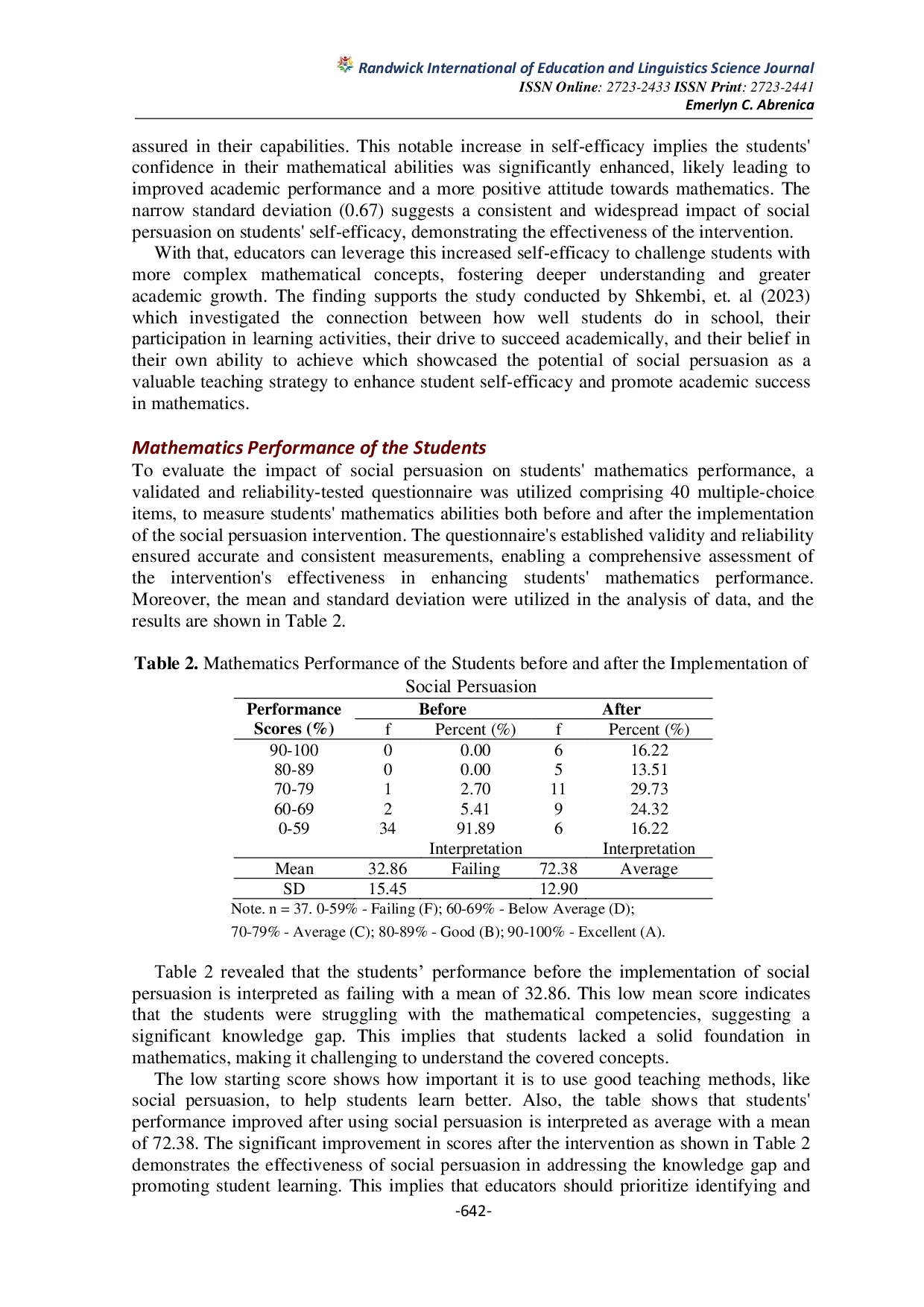 Randwick International of Education and Linguistics Science JournalRandwick International of Education and Linguistics Science JournalThis study aimed to investigate the impact of social persuasion as a strategic intervention on Grade 7 students self-efficacy and Mathematics performance. A pre-test-post-test experimental design was employed, with a self-efficacy questionnaire administered to assess students perceived capabilities in solving mathematical problems. The social persuasion strategy was implemented over a period of 5 weeks, involving persuasive messages and feedback aimed at enhancing students confidence and self-efficacy in Mathematics. After the implementation, results showed a significant positive relationship between self-efficacy and Mathematics performance, indicating that students confidence in their abilities was strongly linked to their academic achievement. The post-test results revealed a significant increase in self-efficacy and Mathematics achievement compared to the pre-test scores, demonstrating the effectiveness of social persuasion in enhancing students self-efficacy and Mathematics performance. The study concluded that social persuasion is a powerful strategic intervention in promoting students self-efficacy and academic achievement in Mathematics. The findings suggest that incorporating social persuasion techniques in Mathematics learning environments can foster a positive intervention, boost students confidence, and improve their academic achievement. The results have implications for teaching practices, highlighting the importance of promoting self-efficacy in students to enhance their academic success.