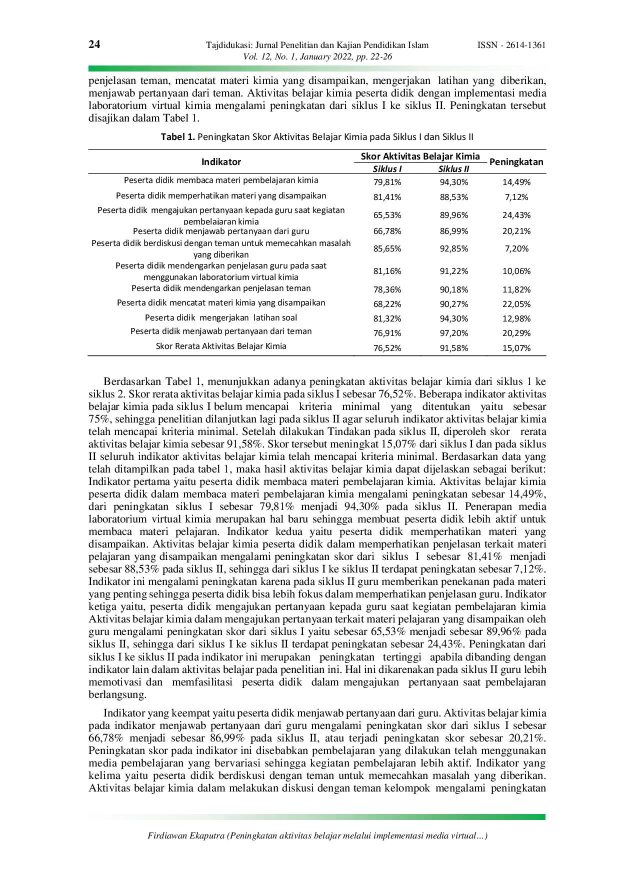 Tajdidukasi: Jurnal Penelitian dan Kajian Pendidikan IslamTajdidukasi: Jurnal Penelitian dan Kajian Pendidikan IslamPenelitian ini bertujuan untuk mengetahui peningkatan aktivitas belajar peserta didik kelas XI materi asam basa SMA Muhammadiyah 1 Yogyakarta melalui implementasi media laboratorium virtual kimia pada masa Covid-19. Penelitian ini menggunakan Penelitian Tindakan Kelas (PTK) yang dilakukan dalam dua siklus. Pengumpulan data dilakukan melalui observasi partisipatif, catatan lapangan, dan dokumentasi. Instrumen penelitian terdiri dari lembar observasi dan catatan lapangan, dengan analisis data deskriptif kuantitatif menggunakan persentase. Hasil penelitian menunjukkan bahwa penerapan media laboratorium virtual kimia dapat meningkatkan aktivitas belajar kimia peserta didik kelas XI MIPA 8 SMA Muhammadiyah 1 Yogyakarta Tahun Pelajaran 2020/2021, dengan peningkatan persentase rerata aktivitas belajar kimia yang signifikan, yaitu 15,07%.