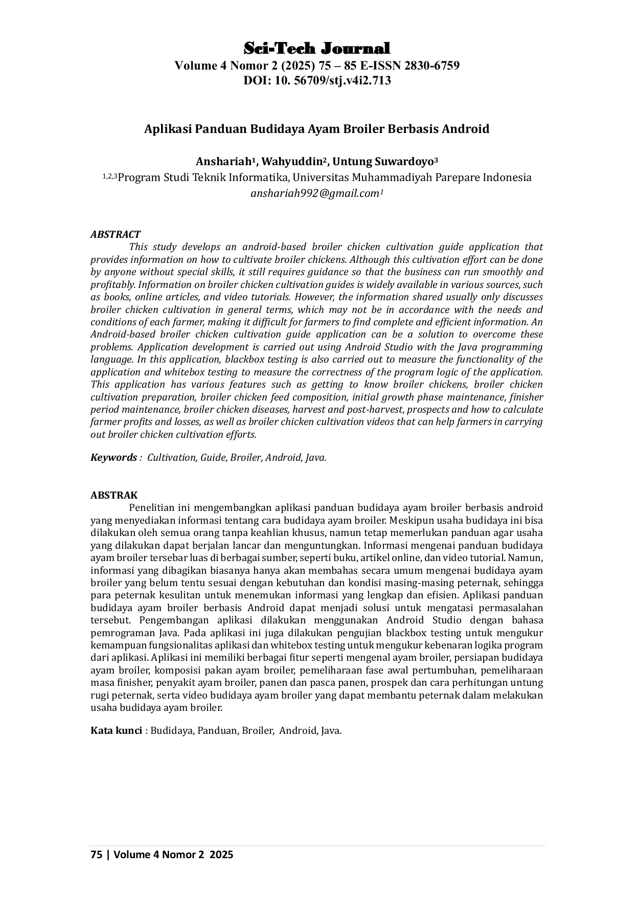 Sci-tech JournalSci-tech JournalPenelitian ini mengembangkan yang menyediakan informasi tentang cara budidaya ayam broiler. Meskipun usaha budidaya ini bisa dilakukan oleh semua orang tanpa keahlian khusus, namun tetap memerlukan panduan agar usaha yang dilakukan dapat berjalan lancar dan menguntungkan. Informasi mengenai panduan budidaya ayam broiler tersebar luas di berbagai sumber, seperti buku, artikel online, dan video tutorial. Namun, informasi yang dibagikan biasanya hanya akan membahas secara umum mengenai budidaya ayam broiler yang belum tentu sesuai dengan kebutuhan dan kondisi masing-masing peternak, sehingga para peternak kesulitan untuk menemukan informasi yang lengkap dan efisien. dapat menjadi solusi untuk mengatasi permasalahan tersebut. Pengembangan aplikasi dilakukan menggunakan Android Studio dengan bahasa pemrograman Java. Pada aplikasi ini juga dilakukan pengujian blackbox testing untuk mengukur kemampuan fungsionalitas aplikasi dan whitebox testing untuk mengukur kebenaran logika program dari aplikasi. Aplikasi ini memiliki berbagai fitur seperti mengenal ayam broiler, persiapan budidaya ayam broiler, komposisi pakan ayam broiler, pemeliharaan fase awal pertumbuhan, pemeliharaan masa finisher, penyakit ayam broiler, panen dan pasca panen, prospek dan cara perhitungan untung rugi peternak, serta video budidaya ayam broiler yang dapat membantu peternak dalam melakukan usaha budidaya ayam broiler.