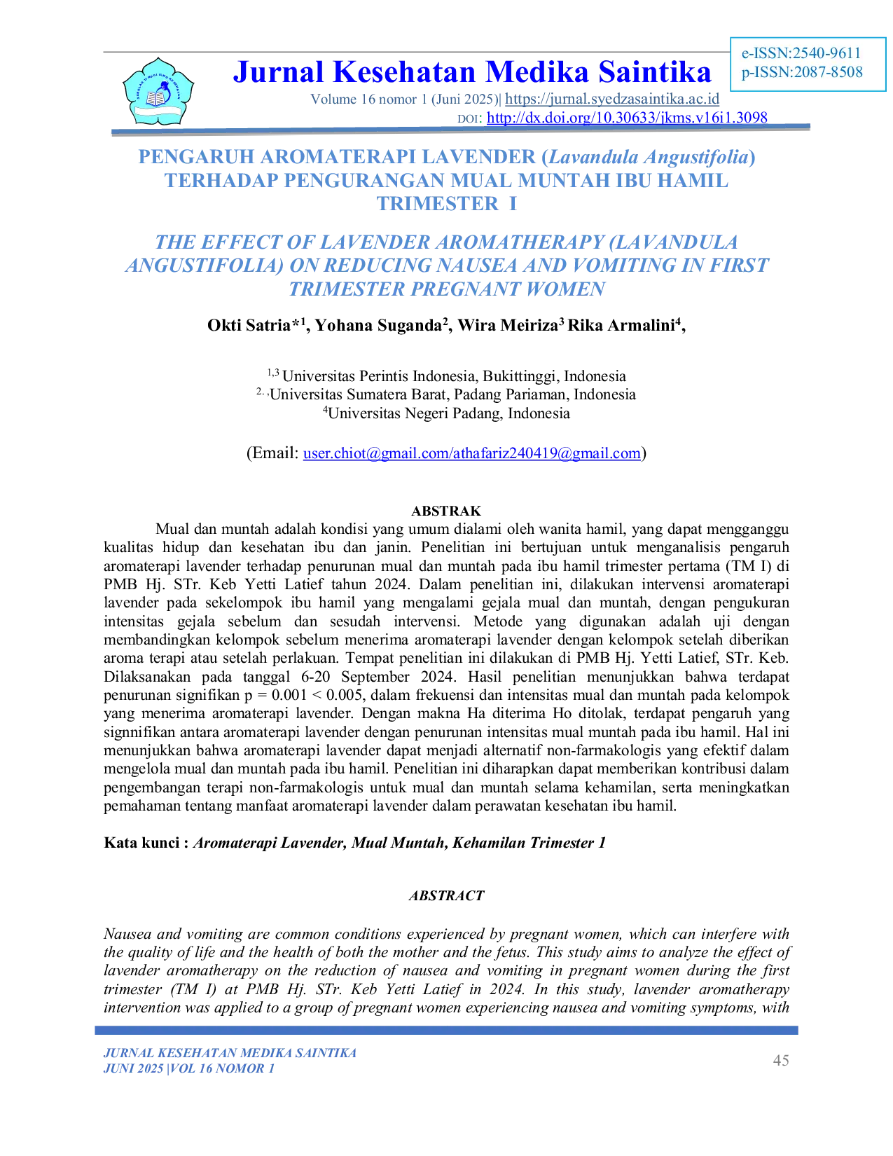 Jurnal Kesehatan Medika SaintikaJurnal Kesehatan Medika SaintikaMual dan muntah adalah kondisi umum pada ibu hamil yang dapat mengganggu kualitas hidup dan kesehatan ibu serta janin. Penelitian ini bertujuan menganalisis pengaruh aromaterapi lavender terhadap penurunan mual dan muntah pada ibu hamil trimester pertama di PMB Hj. STr. Keb Yetti Latief tahun 2024. Metode penelitian adalah uji komparatif antara kelompok sebelum dan sesudah pemberian aromaterapi lavender. Hasil penelitian menunjukkan penurunan signifikan (p = 0.001 < 0.005) dalam frekuensi dan intensitas mual dan muntah pada kelompok yang menerima aromaterapi lavender, yang mengindikasikan bahwa aromaterapi lavender dapat menjadi alternatif non-farmakologis yang efektif dalam mengelola mual dan muntah selama kehamilan.