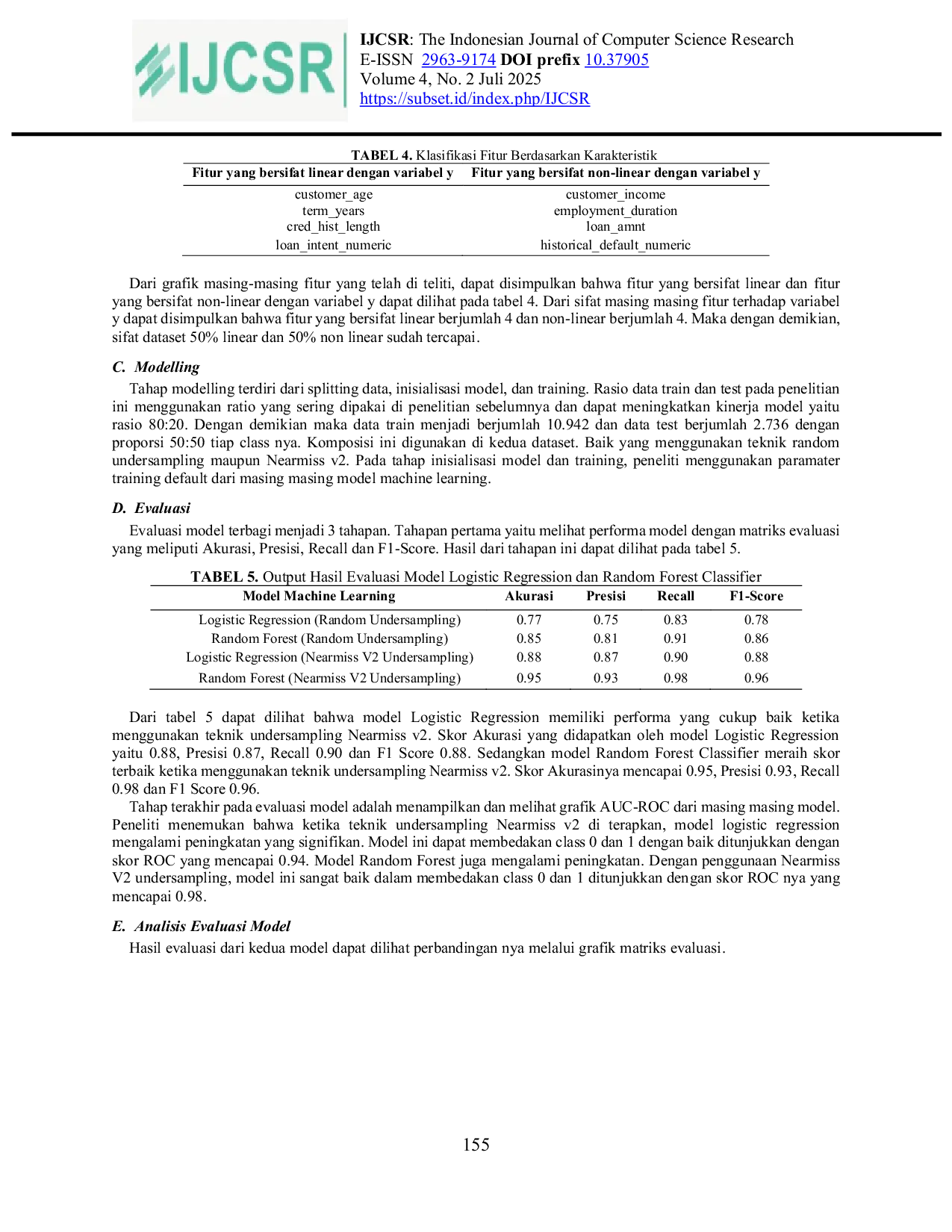 Pertama, penelitian lanjutan dapat menguji kombinasi dari Logistic Regression dan Random Forest dalam ensemble model untuk melihat apakah integrasi kedua pendekatan linier dan non-linier dapat meningkatkan akurasi sekaligus mengurangi waktu pelatihan. Kedua, perlu dilakukan studi tentang dampak penyesuaian hyperparameter pada Random Forest, terutama dalam konteks dataset kredit yang seimbang, untuk mengidentifikasi konfigurasi optimal yang dapat mempertahankan kinerja tinggi namun dengan efisiensi komputasi yang lebih baik. Ketiga, pengembangan model hibrida yang memanfaatkan feature selection berbasis heatmap dan teknik undersampling lain seperti Tomek Links atau SMOTE-ENN perlu dieksplorasi untuk menilai apakah pendekatan tersebut dapat menghasilkan kualitas prediksi yang lebih stabil di berbagai kondisi data kredit yang tidak seimbang. Idealnya, penelitian juga membandingkan performa model pada data aktual dari lembaga keuangan lokal untuk memastikan relevansi praktis. Selain itu, penting untuk mengevaluasi interpretabilitas model terbaik agar hasil prediksi dapat dijelaskan kepada pihak manajemen risiko. Studi lebih lanjut juga bisa mengeksplorasi penambahan fitur non-finansial seperti riwayat sosial media atau pola transaksi digital. Pengujian model pada dataset dengan karakteristik berbeda, seperti lebih dominan linear atau non-linear, akan memberikan wawasan tentang generalisasi model. Penerapan teknik cross-validation yang lebih robust juga sebaiknya diintegrasikan untuk menguji konsistensi hasil. Terakhir, penelitian bisa mengevaluasi trade-off antara akurasi dan kecepatan dalam skenario dunia nyata yang membutuhkan keputusan real-time.