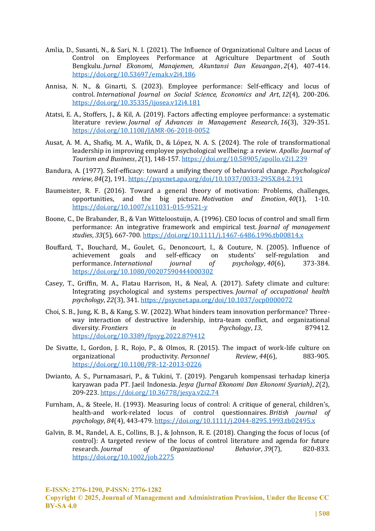 Journal of Management and Administration ProvisionJournal of Management and Administration ProvisionPenelitian ini bertujuan untuk menganalisis pengaruh Self-Efficacy dan Locus of Control terhadap Kinerja Pegawai dengan Budaya Organisasi sebagai Moderator di Kantor Imigrasi Kelas I TPI Padang. Alasan penelitian ini dilakukan adalah ditemukannya tingkat kinerja pegawai yang rendah melalui survei pra-penelitian, serta pentingnya Self-Efficacy dan Locus of Control dalam meningkatkan kinerja di lingkungan pelayanan publik. Metode yang digunakan dalam penelitian ini adalah pendekatan kuantitatif dengan teknik total sampling yang melibatkan 74 responden. Untuk menganalisis data, digunakan Structural Equation Modeling Partial Least Square (SEM-PLS) dengan bantuan perangkat lunak SmartPLS. Temuan penelitian ini menunjukkan bahwa: (1) Self-Efficacy memiliki pengaruh positif dan signifikan terhadap kinerja pegawai (β = 0.376, p = 0.000), (2) Locus of Control memiliki pengaruh positif dan signifikan terhadap kinerja pegawai (β = 0.412, p = 0.000), (3) Budaya Organisasi secara positif dan signifikan memoderasi hubungan antara Self-Efficacy dan kinerja pegawai (β = 0.254, p = 0.031), (4) Budaya Organisasi secara positif dan signifikan memoderasi hubungan antara Locus of Control dan kinerja pegawai (β = 0.104, p = 0.000). Penelitian ini juga mengonfirmasi Teori Pengaturan Tujuan sebagai dasar teoritis, yang menunjukkan bahwa penetapan tujuan yang jelas dan spesifik dapat meningkatkan motivasi dan kinerja pegawai. Hasil penelitian ini memberikan kontribusi praktis bagi manajemen Kantor Imigrasi Kelas I TPI Padang untuk menetapkan tujuan yang dapat diukur dan menantang serta menciptakan budaya organisasi yang mendukung pencapaian kinerja pegawai secara berkelanjutan.