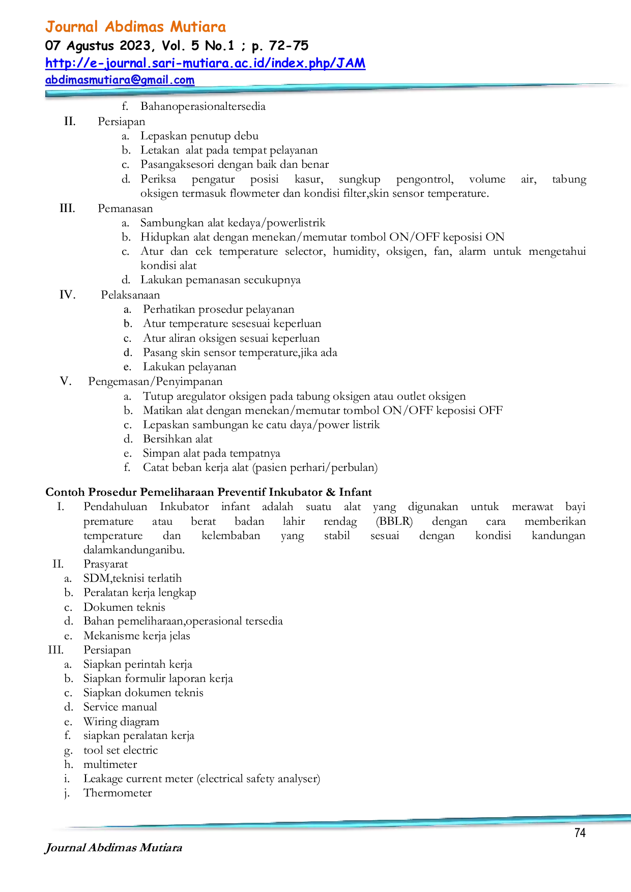 Jurnal Abdimas MutiaraJurnal Abdimas MutiaraPeralatan medis sebagai bagian peralatan kesehatan memerlukan kalibrasi, pemeliharaan, perbaikan, pelatihan pengguna, dan dekomisioning. Kegiatan ini biasanya dikelola oleh tenaga teknis (elektromedis/clinical engineer). Peralatan medis digunakan untuk tujuan diagnosis tertentu dan pengobatan penyakit atau rehabilitasi setelah penyakit atau luka, baik sendiri maupun bersama aksesori, bahan operasional, atau bagian lain dari peralatan medis. Pedomannya tidak mencakup implan, peralatan sekali pakai, atau peralatan yang dapat dibuang. Peralatan medis merupakan peralatan yang digunakan untuk keperluan terapi, rehabilitasi, dan penelitian medik, baik secara langsung maupun tidak langsung.