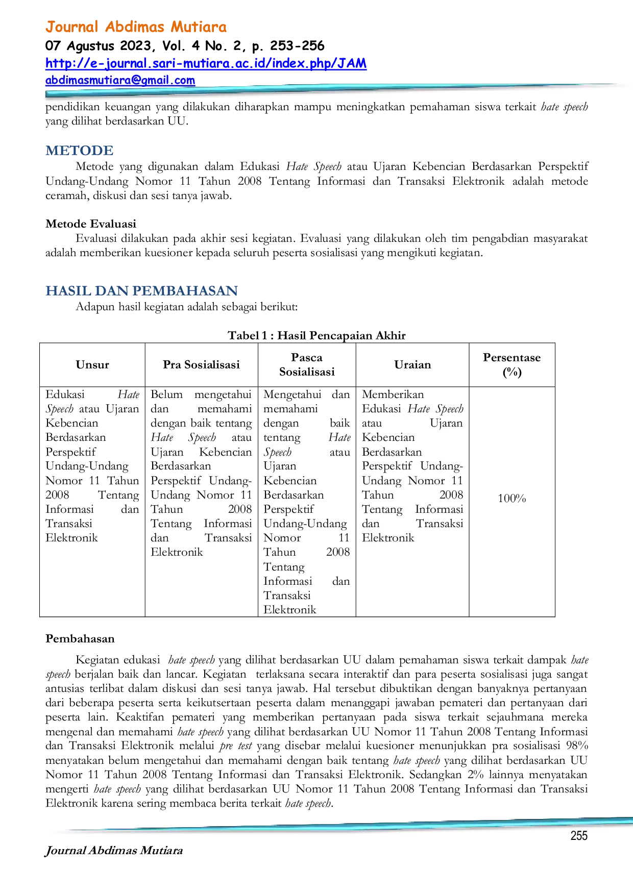 Jurnal Abdimas MutiaraJurnal Abdimas MutiaraKegiatan pengabdian masyarakat ini bertujuan untuk meningkatkan pemahaman siswa mengenai *hate speech* yang ditinjau dari Undang-Undang No. 11 Tahun 2008 Tentang ITE. Permasalahan yang dihadapi adalah kurangnya pengetahuan siswa mengenai dampak *hate speech*. Hasil sosialisasi menunjukkan bahwa sebelum sosialisasi, 98% siswa belum mengetahui dan memahami *hate speech* berdasarkan UU No. 11 Tahun 2008 tentang Informasi dan Transaksi Elektronik, sementara 2% lainnya menyatakan mengerti karena sering membaca berita terkait. Setelah sosialisasi, 100% siswa SMK Swasta 2 Mulia Medan memahami *hate speech* berdasarkan UU No. 11 Tahun 2008 tentang Informasi dan Transaksi Elektronik dan mulai menyadari pentingnya etika dalam bermedia sosial.
