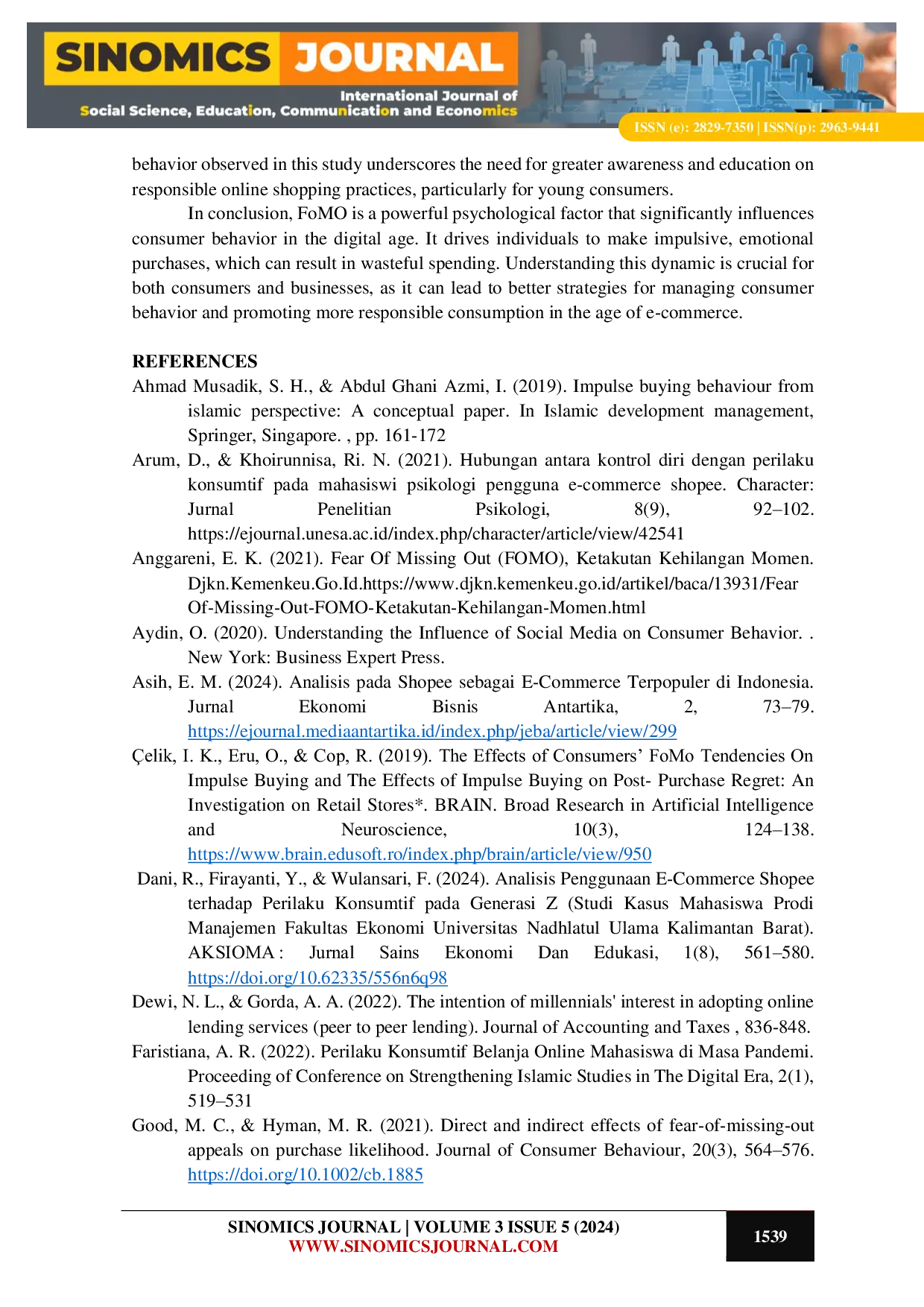 International Journal of Social Science, Education, Communication and EconomicsInternational Journal of Social Science, Education, Communication and EconomicsThis study aims to analyze the impact of Fear of Missing Out (FoMO) on consumer behavior among adolescent Shopee users in Jakarta. Shopee, as a popular e-commerce platform in Indonesia, has influenced consumption patterns, especially among female students, through attractive promotions such as discounts and free shipping. FoMO, which is the fear of missing out on popular opportunities or trends, can drive individuals to make impulsive purchases, even when these purchases do not meet their basic needs. This research employs a quantitative method using FoMO and consumer behavior measurement tools that have been validated. The results of the analysis indicate that FoMO has a positive influence on consumer behavior, with an influence rate of 59.6%. These findings suggest that higher levels of FoMO are associated with a greater likelihood of engaging in consumptive behavior, such as buying items merely to avoid missing out on discounts. This study reinforces the understanding that psychological factors such as FoMO can influence irrational purchasing decisions among adolescent e-commerce users.