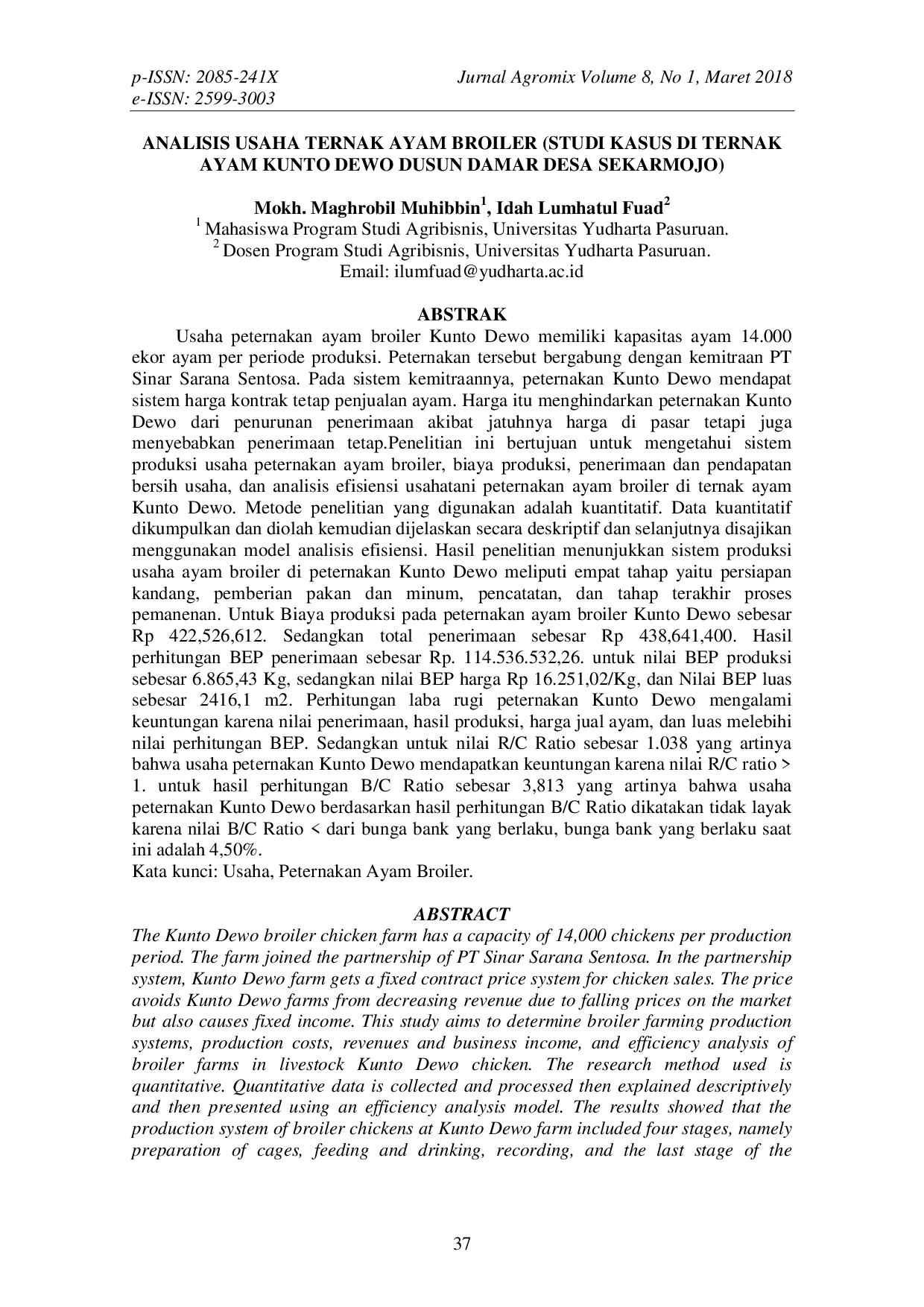 AGROMIXAGROMIXUsaha peternakan ayam broiler Kunto Dewo memiliki kapasitas ayam 14.000 ekor per periode produksi. Peternakan tersebut bergabung dengan kemitraan PT Sinar Sarana Sentosa. Pada sistem kemitraannya, peternakan Kunto Dewo mendapat sistem harga kontrak tetap penjualan ayam. Harga itu menghindarkan peternakan Kunto Dewo dari penurunan penerimaan akibat jatuhnya harga di pasar tetapi juga menyebabkan penerimaan tetap. Penelitian ini bertujuan untuk mengetahui sistem produksi usaha peternakan ayam broiler, biaya produksi, penerimaan dan pendapatan bersih usaha, dan analisis efisiensi usahatani peternakan ayam broiler di ternak ayam Kunto Dewo. Metode penelitian yang digunakan adalah kuantitatif. Data kuantitatif dikumpulkan dan diolah kemudian dijelaskan secara deskriptif dan selanjutnya disajikan menggunakan model analisis efisiensi. Hasil penelitian menunjukkan sistem produksi usaha ayam broiler di peternakan Kunto Dewo meliputi empat tahap yaitu persiapan kandang, pemberian pakan dan minum, pencatatan, dan tahap terakhir proses pemanenan. Untuk biaya produksi pada peternakan ayam broiler Kunto Dewo sebesar Rp 422.526.612. Sedangkan total penerimaan sebesar Rp 438.641.400. Hasil perhitungan BEP penerimaan sebesar Rp 114.536.532,26. Untuk nilai BEP produksi sebesar 6.865,43 kg, sedangkan nilai BEP harga Rp 16.251,02/kg, dan nilai BEP luas sebesar 2416,1 m². Perhitungan laba rugi peternakan Kunto Dewo mengalami keuntungan karena nilai penerimaan, hasil produksi, harga jual ayam, dan luas melebihi nilai perhitungan BEP. Sedangkan untuk nilai R/C Ratio sebesar 1,038 yang artinya bahwa usaha peternakan Kunto Dewo mendapatkan keuntungan karena nilai R/C ratio > 1. Untuk hasil perhitungan B/C Ratio sebesar 3,813 yang artinya bahwa usaha peternakan Kunto Dewo berdasarkan hasil perhitungan B/C Ratio dikatakan tidak layak karena nilai B/C Ratio < dari bunga bank yang berlaku, bunga bank yang berlaku saat ini adalah 4,50%.