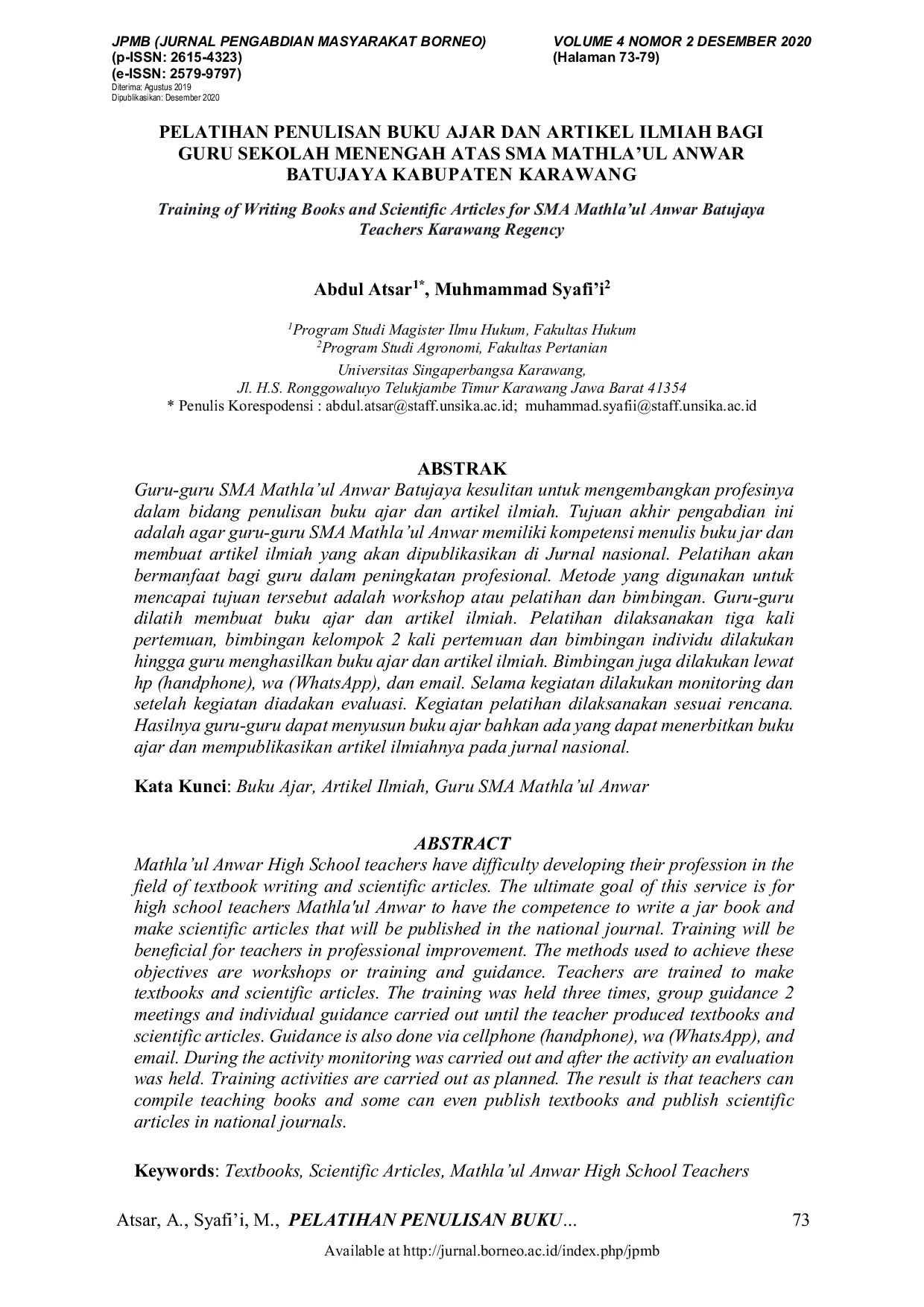 Jurnal Pengabdian Masyarakat BorneoJurnal Pengabdian Masyarakat BorneoGuru-guru SMA Mathlaul Anwar Batujaya kesulitan untuk mengembangkan profesinya dalam bidang penulisan buku ajar dan artikel ilmiah. Tujuan akhir pengabdian ini adalah agar guru-guru SMA Mathlaul Anwar memiliki kompetensi menulis buku ajar dan membuat artikel ilmiah yang akan dipublikasikan di Jurnal nasional. Pelatihan akan bermanfaat bagi guru dalam peningkatan profesional. Metode yang digunakan untuk mencapai tujuan tersebut adalah workshop atau pelatihan dan bimbingan. Guru-guru dilatih membuat buku ajar dan artikel ilmiah. Pelatihan dilaksanakan tiga kali pertemuan, bimbingan kelompok 2 kali pertemuan dan bimbingan individu dilakukan hingga guru menghasilkan buku ajar dan artikel ilmiah. Bimbingan juga dilakukan lewat hp (handphone), wa (WhatsApp), dan email. Selama kegiatan dilakukan monitoring dan setelah kegiatan diadakan evaluasi. Kegiatan pelatihan dilaksanakan sesuai rencana. Hasilnya guru-guru dapat menyusun buku ajar bahkan ada yang dapat menerbitkan buku ajar dan mempublikasikan artikel ilmiahnya pada jurnal nasional.