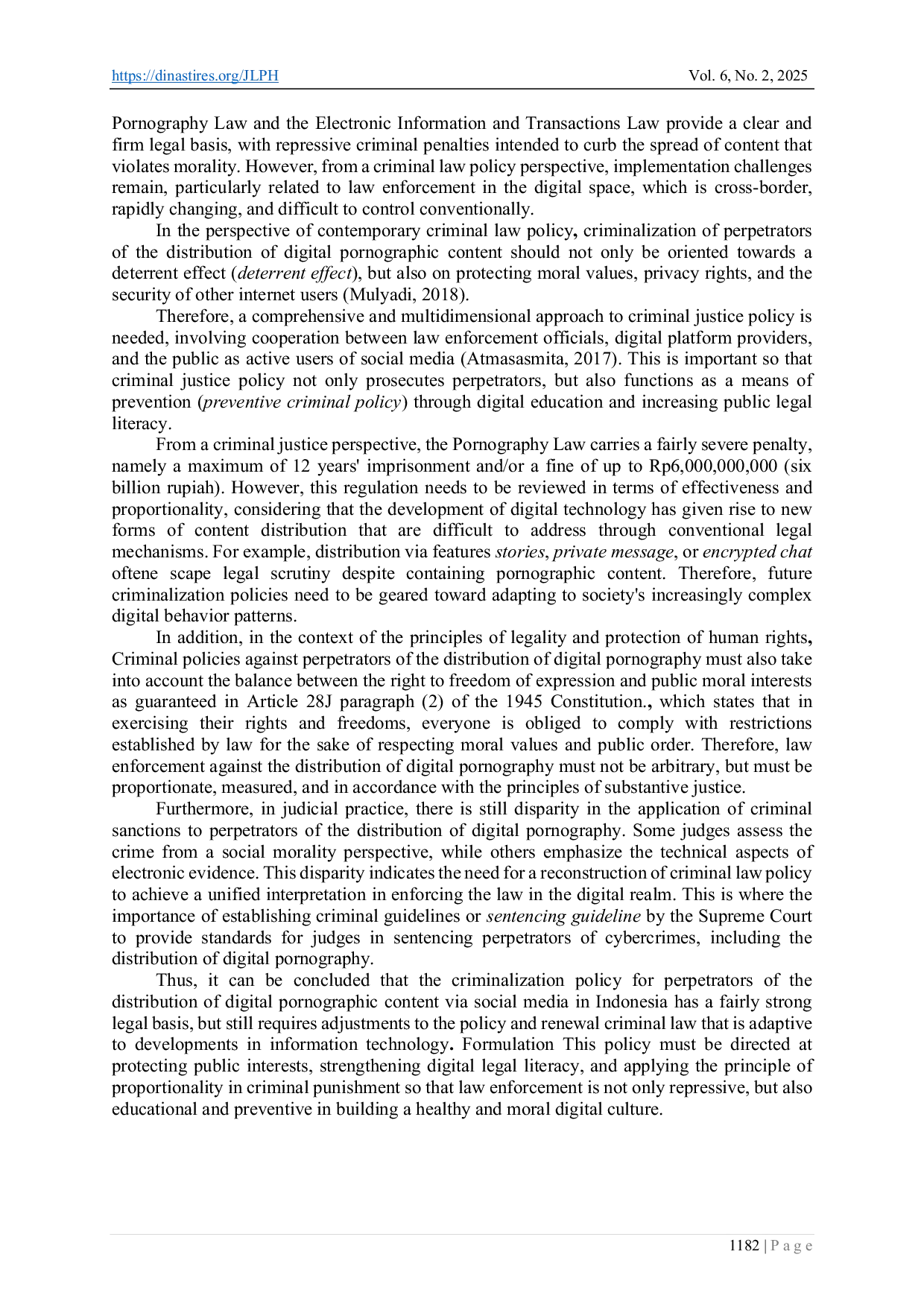The criminal policy regulations for perpetrators of the distribution of digital pornographic content via social media in Indonesia have a strong legal basis through the Pornography Law and the ITE Law.However, the implementation of these policies still faces challenges related to the dynamics of technological development.Therefore, an adaptive reconstruction of criminal law policy is needed, balancing repressive and preventive approaches, strengthening coordination between law enforcement agencies, and prioritizing the protection of human rights and digital literacy.
