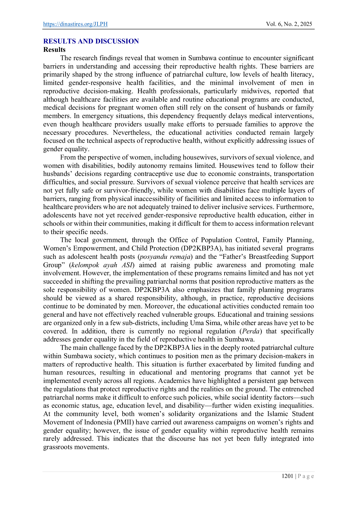 Pemahaman dan akses perempuan terhadap hak kesehatan reproduksi di Sumbawa masih dibatasi oleh budaya patriarki, rendahnya tingkat literasi, layanan kesehatan yang tidak sensitif terhadap gender, serta terbatasnya keterlibatan laki-laki dalam program keluarga berencana.Meskipun hak reproduksi diakui secara hukum di Indonesia, implementasinya tetap terbatas akibat norma sosial dan stigma yang mengikis otonomi tubuh perempuan.Perlindungan hak-hak ini memerlukan pendekatan interseksional melalui penguatan regulasi, pendidikan, pemberdayaan komunitas, kolaborasi lintas sektor, serta pelatihan sensitif gender bagi penyedia layanan kesehatan.