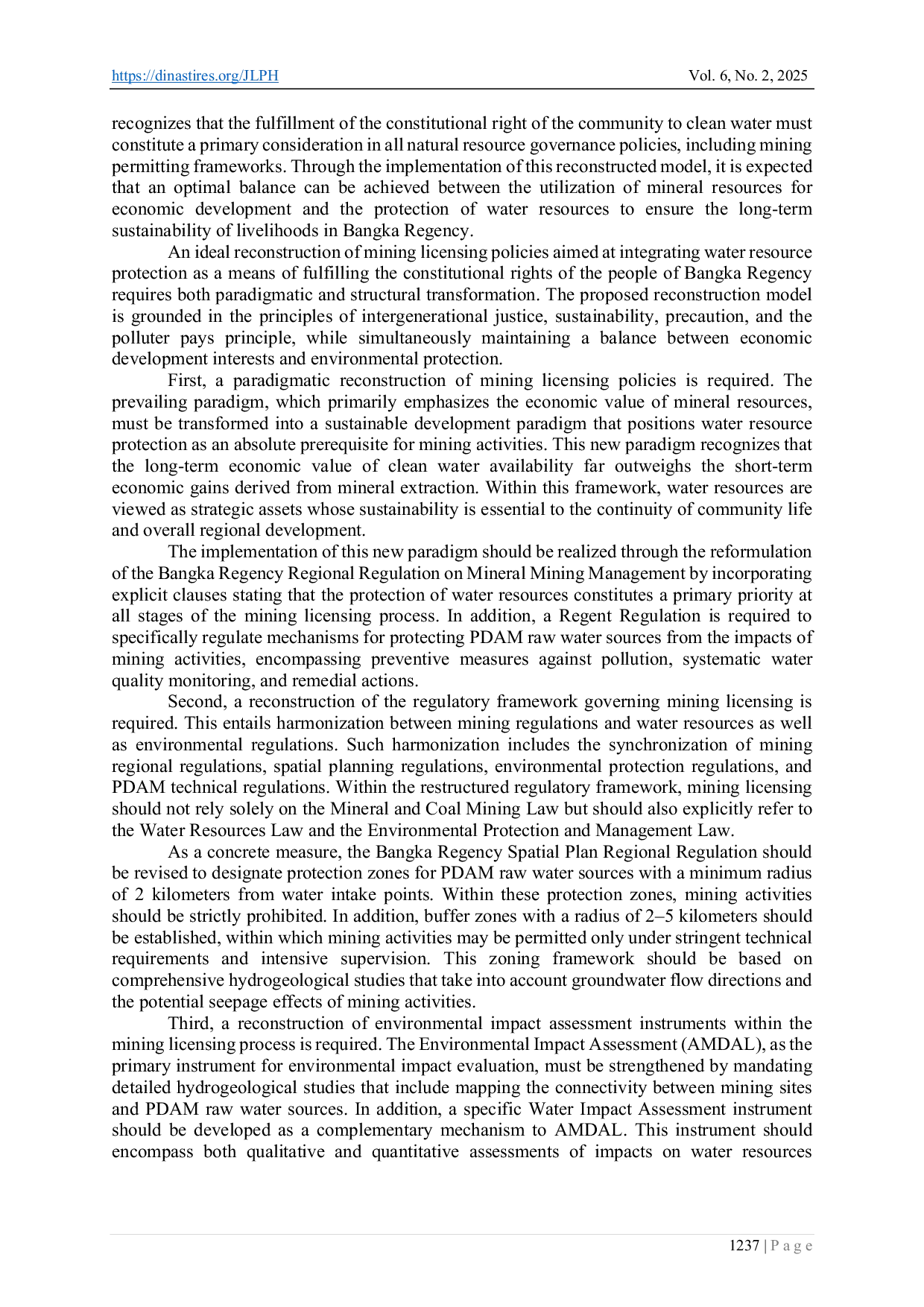 Berdasarkan analisis di atas, penelitian ini menyimpulkan bahwa kebijakan perizinan pertambangan saat ini di Kabupaten Bangka belum efektif dalam melindungi sumber daya air maupun dalam menjamin pemenuhan hak konstitusional masyarakat atas air bersih.Ketidakefektifan ini tercermin dalam beberapa aspek mendasar, yaitu.(1) proses perizinan yang tidak memprioritaskan perlindungan sumber daya air sebagai pertimbangan utama.(2) kelemahan dokumen Analisis Mengenai Dampak Lingkungan (AMDAL) dalam menilai dampak terhadap sumber air PDAM.(3) tidak adanya zona perlindungan sumber air dalam kebijakan tata ruang pertambangan.(4) kurangnya integrasi dengan perhitungan kapasitas lingkungan dan daya serap.(6) sanksi yang gagal menimbulkan efek jera.(7) ketidakjelasan mekanisme pertanggungjawaban dan kompensasi atas pencemaran sumber daya air.dan (8) dominasi paradigma ekonomi-sentris dalam proses perizinan.Kondisi ini telah menyebabkan dampak nyata berupa krisis air bersih yang dialami masyarakat Kabupaten Bangka, sehingga menciptakan kesenjangan yang signifikan antara jaminan konstitusional dalam Konstitusi 1945 dan implementasinya di lapangan.