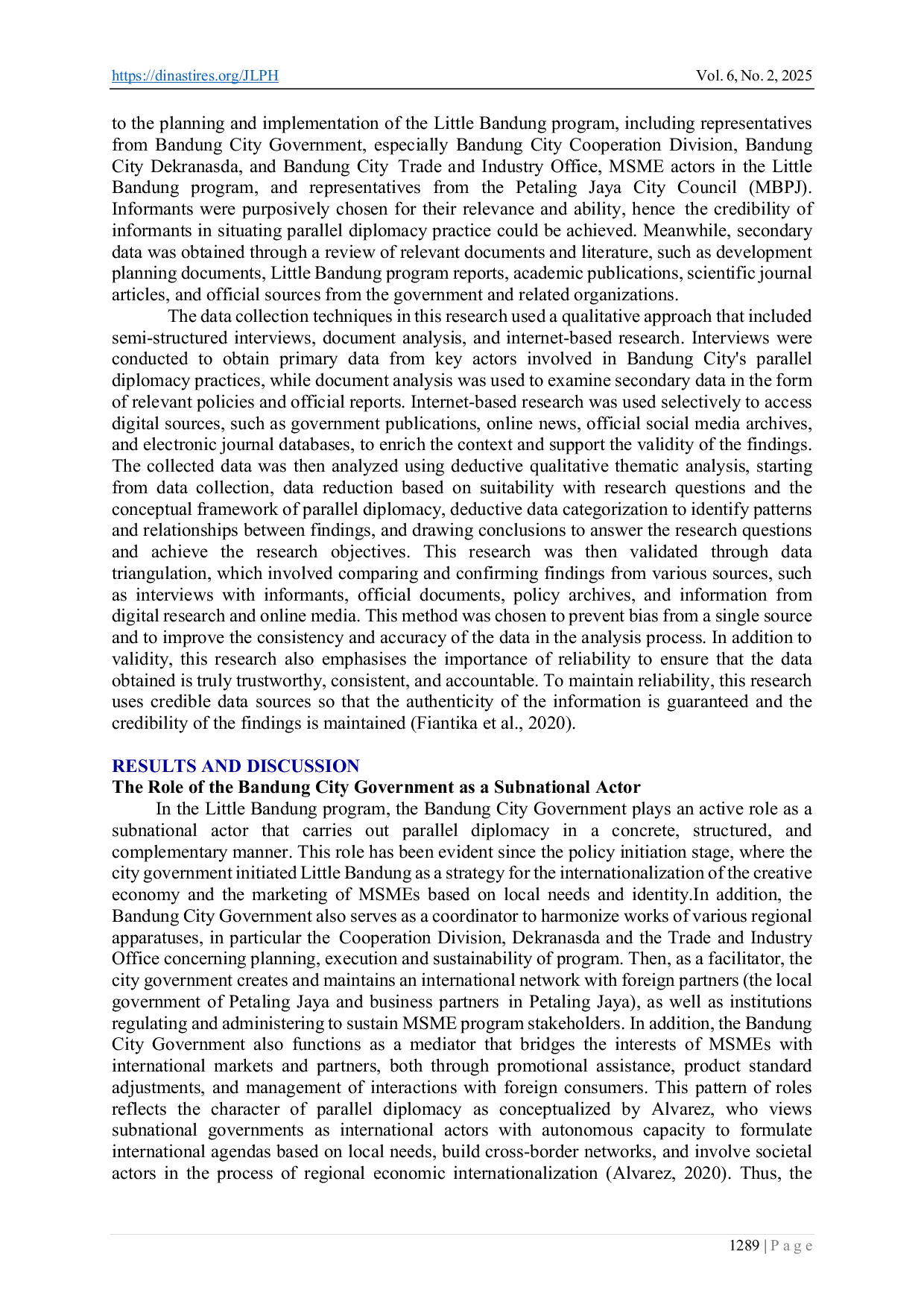 Journal of Law, Politic and HumanitiesJournal of Law, Politic and HumanitiesArtikel ini membahas diplomasi paralel yang dilakukan oleh Pemerintah Kota Bandung melalui Program Little Bandung sebagai strategi pemasaran bagi Usaha Mikro Kecil dan Menengah (UMKM) di tingkat internasional. Latar belakang penelitian ini bersumber dari peran subnasional yang semakin meningkat dalam hubungan internasional dan kebutuhan pemerintah daerah untuk memperluas akses pasar bagi UMKM sebagai penggerak ekonomi lokal. Penelitian ini bertujuan untuk menganalisis bagaimana diplomasi paralel diimplementasikan oleh Pemerintah Kota Bandung dalam Program Little Bandung dan peran UMKM sebagai aktor masyarakat yang mendukung diplomasi subnasional. Penelitian ini menggunakan pendekatan kualitatif melalui pengumpulan data primer dalam bentuk wawancara dan data sekunder melalui studi dokumen dan literatur terkait. Hasil penelitian menunjukkan bahwa Little Bandung adalah praktik diplomasi paralel yang otonom, berdasarkan kebutuhan regional, dan dilakukan melalui kolaborasi lintas aktor, termasuk pemerintah kota, UMKM, mitra asing, dan komunitas diaspora. UMKM tidak hanya berperan sebagai objek promosi, tetapi juga terlibat aktif dalam interaksi lintas budaya dan pembentukan jaringan ekonomi internasional. Penelitian ini menyimpulkan bahwa diplomasi paralel berbasis UMKM dapat menjadi instrumen strategis untuk internasionalisasi ekonomi lokal dan memperkaya studi diplomasi subnasional dalam studi Hubungan Internasional.