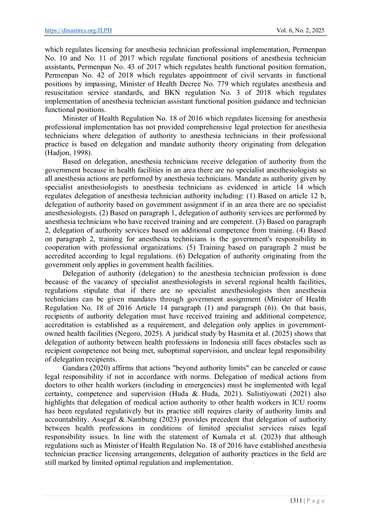 Journal of Law, Politic and HumanitiesJournal of Law, Politic and HumanitiesPelajaran ini bertujuan untuk menganalisis otoritas serta bentuk perlindungan hukum terhadap teknisi anestesi dalam melakukan prosedur anestesi tanpa adanya anestesioloog di rumah sakit. Metode penelitian yang digunakan adalah penelitian hukum normatif dengan pendekatan statutori dan konseptual, menggunakan bahan hukum primer, sekunder, dan tersier, dan dianalisis secara kualitatif. Hasil penelitian menunjukkan ada kesenjangan antara aturan normatif dalam Peraturan Menteri Kesehatan No. 18 tahun 2016 dan praktek empiris di lapangan. Meskipun peraturan mendefinisikan delegasi otoritas (delegasi dan mandat) untuk teknisi anestesi di bawah kondisi tertentu, pelaksanaan masih menghadapi batasan dalam pengawasan dan tanggung jawab hukum yang tidak jelas. Undang-Undang No. 17 tahun 2023 tentang Kesehatan membawa perubahan signifikan dengan memosisikan teknisi anestesi sebagai tenaga kesehatan teknik medis dan membuat standar kompetensi sebagai dasar otoritas, serta memberikan perlindungan hukum terhadap tenaga kesehatan yang bertindak untuk menyelamatkan nyawa pasien dalam situasi darurat.