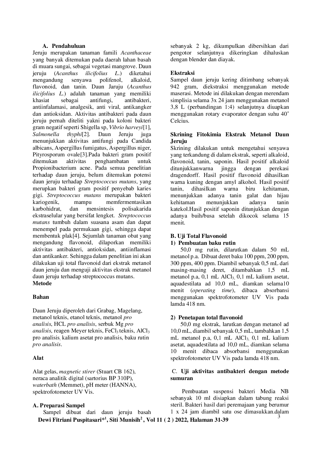 Ekstrak metanol daun jeruju memiliki aktivitas sebagai antibakteri terhadap Streptococcus mutans.Konsentrasi ekstrak 8%, 10%, 20%, 30% merupakan konsentrasi efektif untuk menghambat bakteri Streptococcus mutans.Peningkatan konsentrasi ekstrak metanol daun Jeruju dari 8%, 10%, 20% dan 30% menunjukkan semakin besar diameter zona hambat.