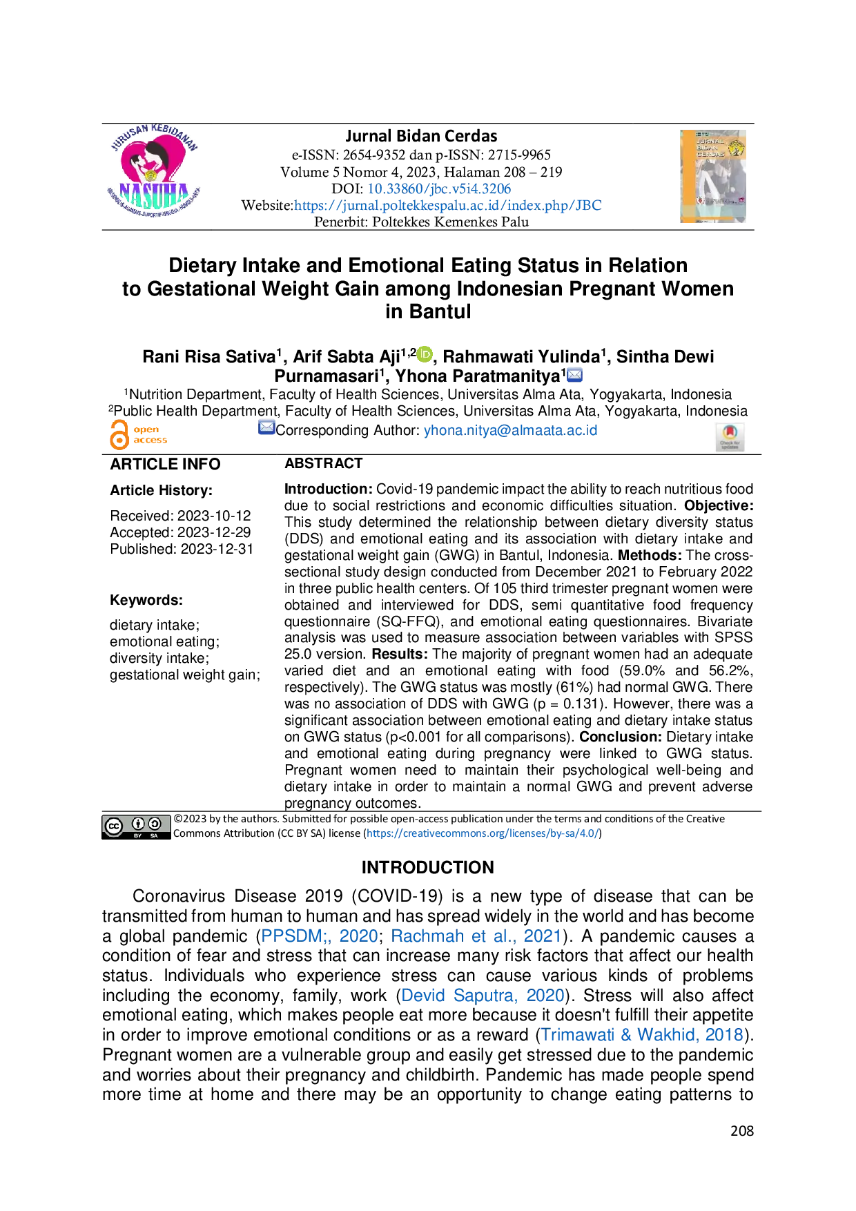Jurnal Bidan CerdasJurnal Bidan CerdasIntroduction: Covid-19 pandemic impact the ability to reach nutritious food due to social restrictions and economic difficulties situation. Objective: This study determined the relationship between dietary diversity status (DDS) and emotional eating and its association with dietary intake and gestational weight gain (GWG) in Bantul, Indonesia. Methods: The cross-sectional study design conducted from December 2021 to February 2022 in three public health centers. Of 105 third trimester pregnant women were obtained and interviewed for DDS, semi quantitative food frequency questionnaire (SQ-FFQ), and emotional eating questionnaires. Bivariate analysis was used to measure association between variables with SPSS 25.0 version. Results: The majority of pregnant women had an adequate varied diet and an emotional eating with food (59.0% and 56.2%, respectively). The GWG status was mostly (61%) had normal GWG. There was no association of DDS with GWG (p = 0.131). However, there was a significant association between emotional eating and dietary intake status on GWG status (p<0.001 for all comparisons). Conclusion: Dietary intake and emotional eating during pregnancy were linked to GWG status. Pregnant women need to maintain their psychological well-being and dietary intake in order to maintain a normal GWG and prevent adverse pregnancy outcomes.