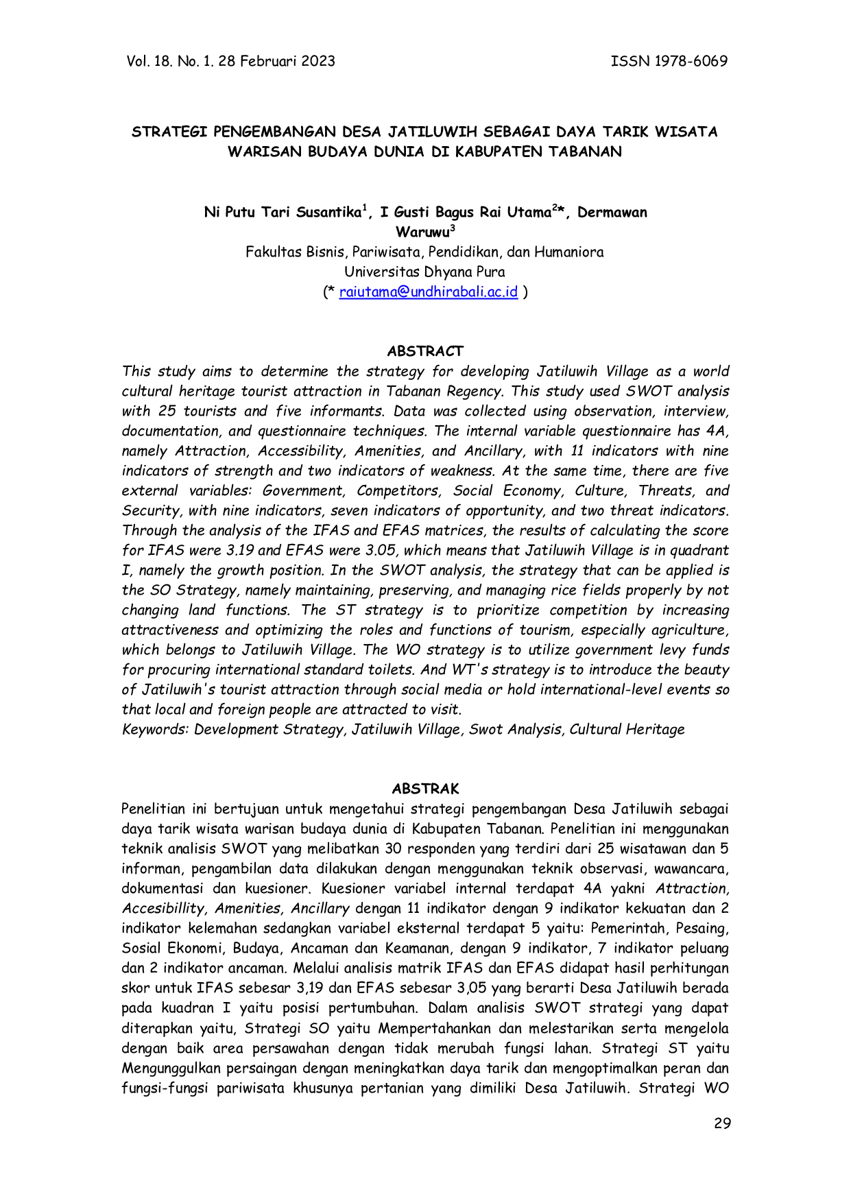 Jurnal Ekonomi dan PariwisataJurnal Ekonomi dan PariwisataPenelitian ini bertujuan untuk mengetahui . Penelitian ini menggunakan teknik analisis SWOT yang melibatkan 30 responden yang terdiri dari 25 wisatawan dan 5 informan, pengambilan data dilakukan dengan menggunakan teknik observasi, wawancara, dokumentasi dan kuesioner. Kuesioner variabel internal terdapat 4A yakni Attraction, Accesibillity, Amenities, Ancillary dengan 11 indikator dengan 9 indikator kekuatan dan 2 indikator kelemahan sedangkan variabel eksternal terdapat 5 yaitu: Pemerintah, Pesaing, Sosial Ekonomi, Budaya, Ancaman dan Keamanan, dengan 9 indikator, 7 indikator peluang dan 2 indikator ancaman. Melalui analisis matrik IFAS dan EFAS didapat hasil perhitungan skor untuk IFAS sebesar 3,19 dan EFAS sebesar 3,05 yang berarti Desa Jatiluwih berada pada kuadran I yaitu posisi pertumbuhan. Dalam analisis SWOT strategi yang dapat diterapkan yaitu, Strategi SO yaitu Mempertahankan dan melestarikan serta mengelola dengan baik area persawahan dengan tidak merubah fungsi lahan. Strategi ST yaitu Mengunggulkan persaingan dengan meningkatkan daya tarik dan mengoptimalkan peran dan fungsi-fungsi pariwisata khusunya pertanian yang dimiliki Desa Jatiluwih. Strategi WO yaitu memanfaatkan dana retribusi pemerintah terkait pengadaan toilet bertaraf internasional. Strategi WT yaitu memperkenalkan keindahan daya tarik wisata Jatiluwih melalui social media, atau mengadakan event-event bertaraf internasional agar masyarakat lokal dan mancanegara tertarik untuk berkunjung.