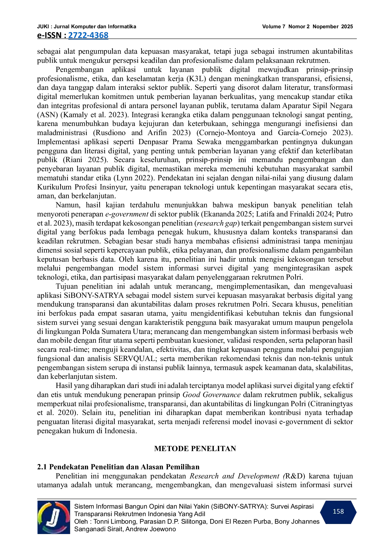 JUKI : Jurnal Komputer dan InformatikaJUKI : Jurnal Komputer dan InformatikaDalam era transformasi digital global, lembaga publik menghadapi tantangan untuk meningkatkan transparansi, akuntabilitas, dan kepercayaan masyarakat melalui penerapan teknologi informasi. Salah satu isu krusial di Indonesia adalah persepsi publik terhadap keadilan dan keterbukaan proses rekrutmen anggota Polri, yang hingga kini dinilai belum sepenuhnya akuntabel. Penelitian ini bertujuan untuk merancang, mengimplementasikan, dan mengevaluasi aplikasi SiBONY-SATRYA (Sistem Informasi Bangun Opini dan Nilai Yakin-Survei Aspirasi Transparansi Rekrutmen Indonesia yang Adil) sebagai model sistem survei digital berbasis partisipasi masyarakat untuk mendukung prinsip Good Governance. Penelitian menggunakan pendekatan Research and Development (R&D) dengan tahapan analisis kebutuhan, perancangan, implementasi berbasis Laravel dan React Native, serta pengujian melalui metode black-box testing, model SERVQUAL, dan analisis regresi linear sederhana. Data dikumpulkan dari 300 responden dan 10 informan ahli melalui survei digital dan wawancara terstruktur. Hasil menunjukkan bahwa sistem berfungsi optimal (100% uji fungsional), waktu respon rata-rata 0,8 detik, efisiensi meningkat 85,7%, partisipasi publik naik 105%, dan kepuasan pengguna mencapai skor rata-rata 4,08 (kategori baik). Persamaan regresi Y = 2,14 0,67X (R² = 0,72, p < 0,05) menegaskan adanya pengaruh positif signifikan antara efektivitas teknologi dan kepuasan masyarakat. Disimpulkan bahwa aplikasi SiBONY-SATRYA efektif dalam memperkuat transparansi, akuntabilitas, dan profesionalisme Polri, serta direkomendasikan untuk diterapkan secara nasional sebagai inovasi e-government menuju transformasi digital pelayanan publik di Indonesia.