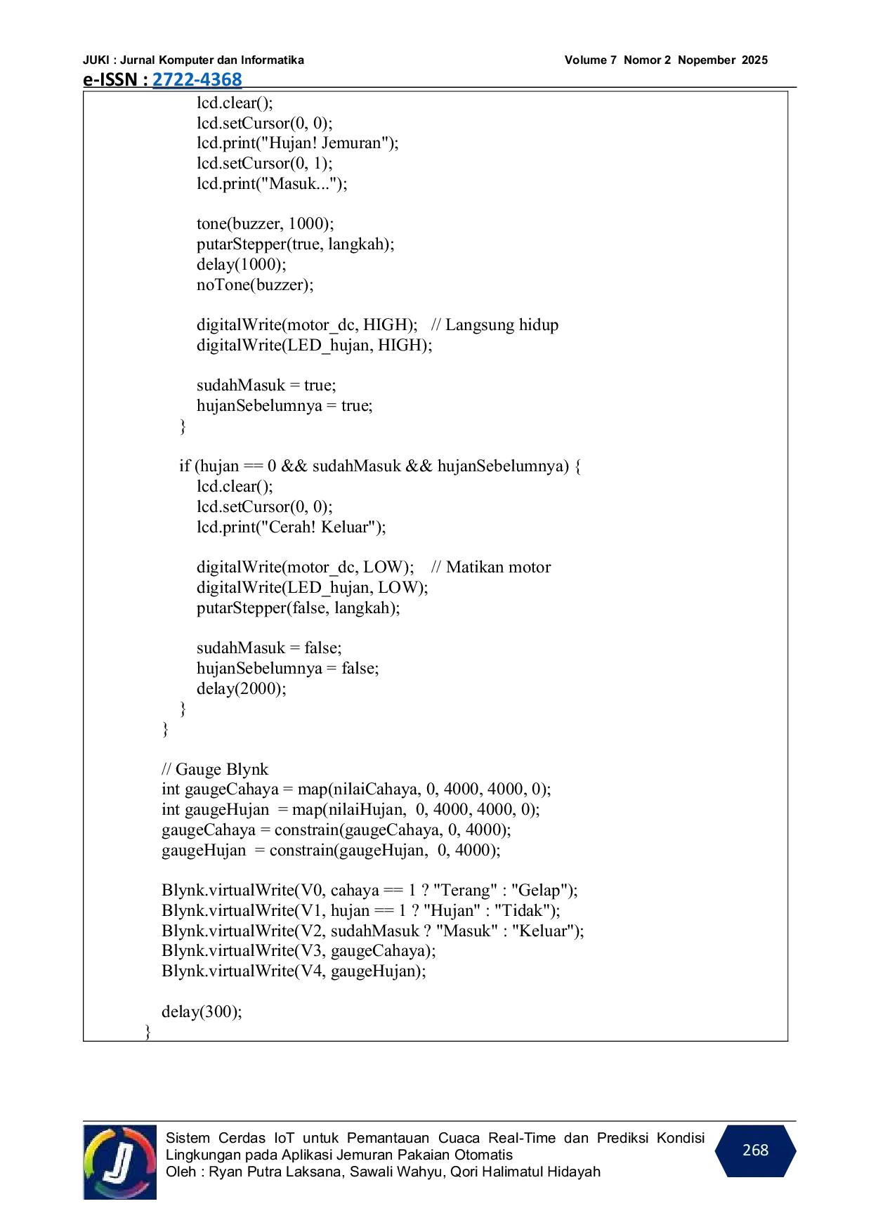JUKI : Jurnal Komputer dan InformatikaJUKI : Jurnal Komputer dan InformatikaKondisi cuaca yang tidak menentu sering menimbulkan permasalahan dalam proses pengeringan pakaian, terutama ketika hujan turun secara tiba-tiba saat pengguna tidak berada di rumah. Untuk mengatasi permasalahan tersebut, penelitian ini menyajikan perancangan dan implementasi sistem jemuran pakaian otomatis berbasis Internet of Things (IoT) yang mampu merespons perubahan cuaca secara real-time. Sistem ini dibangun menggunakan mikrokontroler ESP32 yang terintegrasi dengan sensor hujan dan sensor Light Dependent Resistor (LDR) untuk mendeteksi curah hujan dan intensitas cahaya. Motor stepper digunakan untuk menggerakkan jemuran secara otomatis ke dalam atau ke luar, sedangkan motor DC berfungsi sebagai kipas tambahan untuk membantu proses pengeringan ketika intensitas cahaya matahari tidak mencukupi. Sistem ini juga dilengkapi dengan buzzer, indikator LED, serta layar LCD 16×2 untuk menampilkan informasi status sistem secara real-time. Selain itu, sistem mendukung pemantauan jarak jauh dan kontrol manual melalui aplikasi Blynk pada perangkat seluler. Pengembangan sistem dilakukan menggunakan metode Waterfall dan diuji dalam berbagai kondisi cuaca. Hasil pengujian menunjukkan bahwa sistem yang dirancang dapat beroperasi secara andal, merespons perubahan lingkungan dengan akurat, serta meningkatkan kenyamanan pengguna. Dengan demikian, sistem jemuran otomatis berbasis IoT ini menawarkan solusi yang efektif dan praktis untuk penerapan konsep smart home.