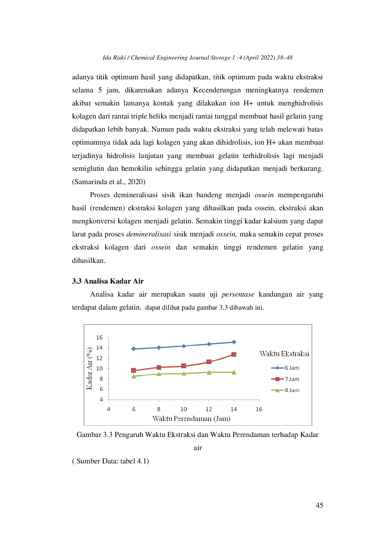 Penelitian ini menunjukkan bahwa produk gelatin tertinggi dihasilkan pada waktu ekstraksi 6 jam dengan lama perendaman 14 jam, yaitu 0,5720 gram, sementara rendemen dan kadar air tertinggi juga diperoleh pada kondisi yang sama.Hasil penelitian ini memenuhi syarat SNI terkait kadar air gelatin.Penelitian lebih lanjut dapat dilakukan untuk mengoptimalkan waktu ekstraksi dan mengkaji variasi rasio perendaman, suhu, dan waktu pengadukan guna meningkatkan rendemen gelatin.
