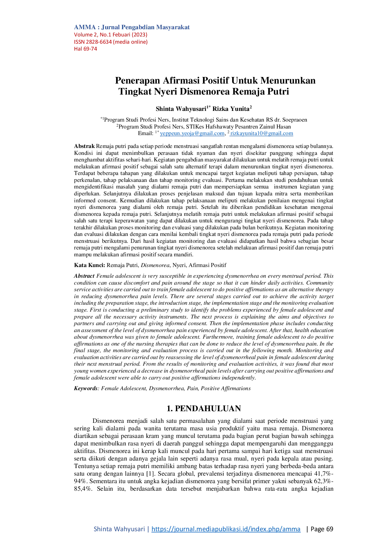 AMMA : Jurnal Pengabdian MasyarakatAMMA : Jurnal Pengabdian MasyarakatRemaja putri rentan mengalami dismenorea setiap bulan, yang dapat menghambat aktivitas sehari-hari. Kegiatan pengabdian masyarakat ini bertujuan untuk melatih remaja putri melakukan afirmasi positif sebagai terapi alternatif untuk menurunkan tingkat nyeri dismenorea. Kegiatan meliputi tahap persiapan, perkenalan, pelaksanaan, dan monitoring evaluasi. Hasil monitoring dan evaluasi menunjukkan bahwa sebagian besar remaja putri mengalami penurunan tingkat nyeri dismenorea setelah melakukan afirmasi positif dan mampu melakukannya secara mandiri.