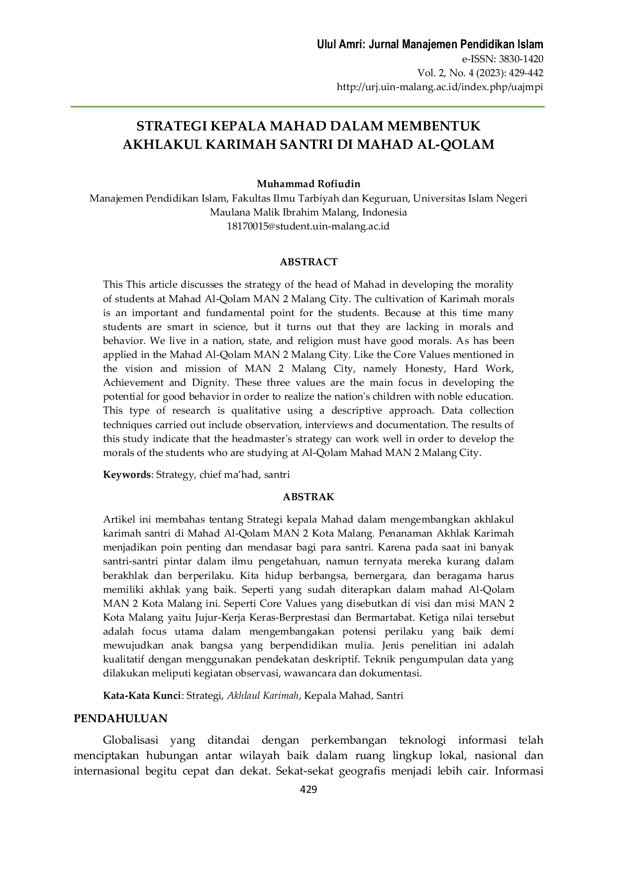 Ulul Amri: Jurnal Manajemen Pendidikan IslamUlul Amri: Jurnal Manajemen Pendidikan IslamArtikel ini membahas tentang Strategi kepala Mahad dalam mengembangkan akhlakul karimah santri di Mahad Al-Qolam MAN 2 Kota Malang. Penanaman Akhlak Karimah menjadi poin penting dan mendasar bagi para santri. Karena pada saat ini banyak santri-santri pintar dalam ilmu pengetahuan, namun ternyata mereka kurang dalam berakhlak dan berperilaku. Kita hidup berbangsa, bernegara, dan beragama harus memiliki akhlak yang baik. Seperti yang sudah diterapkan dalam mahad Al-Qolam MAN 2 Kota Malang ini. Seperti Core Values yang disebutkan di visi dan misi MAN 2 Kota Malang yaitu Jujur-Kerja Keras-Berprestasi dan Bermartabat. Ketiga nilai tersebut adalah focus utama dalam mengembangkan potensi perilaku yang baik demi mewujudkan anak bangsa yang berpendidikan mulia. Jenis penelitian ini adalah kualitatif dengan menggunakan pendekatan deskriptif. Teknik pengumpulan data yang dilakukan meliputi kegiatan observasi, wawancara dan dokumentasi.