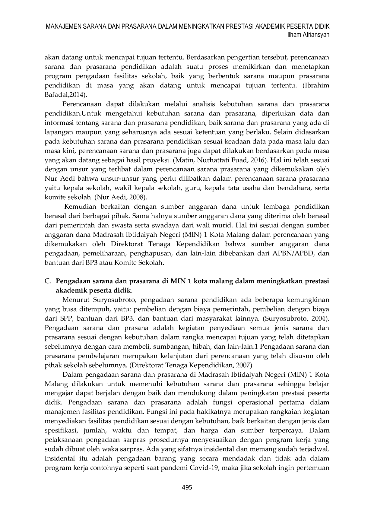 Manajemen sarana dan prasarana di Madrasah Ibtidaiyah Negeri (MIN) 1 Kota Malang telah meliputi tujuh aspek utama yaitu perencanaan, pengadaan, penyaluran, penyimpanan, pemeliharaan, inventarisasi, dan penghapusan, serta sangat mendukung peningkatan prestasi akademik peserta didik.Proses perencanaan dilakukan secara terstruktur dengan melibatkan berbagai pihak dan sesuai kebutuhan serta aturan yang berlaku.Pengadaan dan pemeliharaan sarana prasarana dilaksanakan secara kondisional berdasarkan skala prioritas dan dilakukan secara rutin serta berkala untuk menjaga kesiapan dan umur pakai fasilitas.