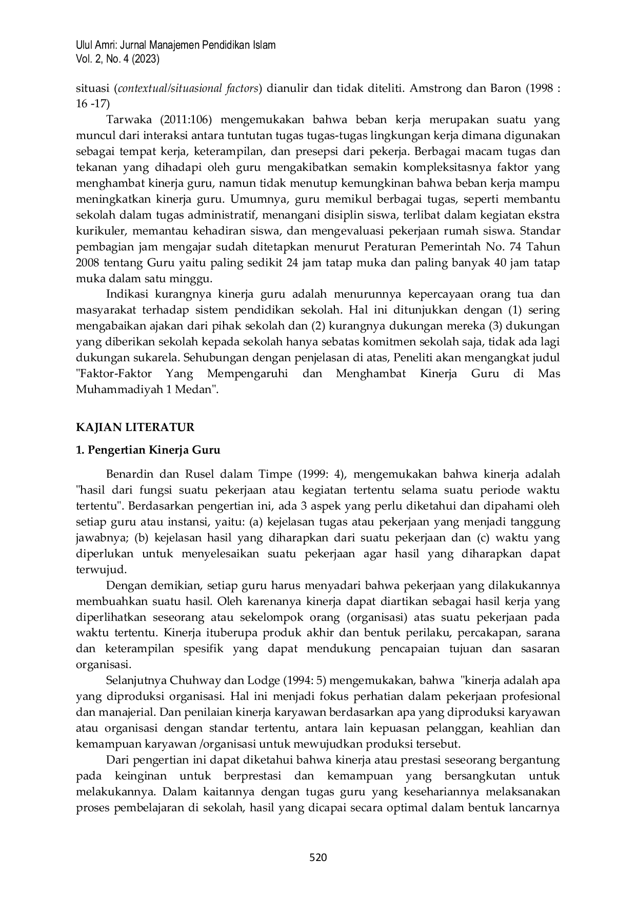 Ulul Amri: Jurnal Manajemen Pendidikan IslamUlul Amri: Jurnal Manajemen Pendidikan IslamPeraturan Menteri Pendidikan dan Nasional Republik Indonesia No. 16 Tahun 2007 menjelaskan bahwa ada empat kompetensi sebagai guru professional yaitu kompetensi pedagogic, professional, sosial dan kepribadian. Empat kompetensi tersebut harus melekat pada orang yang berprofesi sebagai guru sebab melalui empat kompetensi tersebut kinerja guru dapat dilihat apakah meningkat atau hanya statis. Penelitian ini bertujuan untuk mendeskripsikan 1) factor-faktor yang mempengaruhi kinerja guru 2) Faktor-faktor yang menghambat kinerja guru, dan 3) Strategi dalam meningkatkan kinerja guru. Dalam hal ini subjek penelitiannya ialah guru di Mas Muhammadiyah 1 Medan. Adapun metode yang digunakan dalam penelitian ini adalah metode kualitatif natural. Adapun hasil penelitiannya ialah faktor-faktor yang mempengaruhi kinerja pada guru Madrasah Aliyah Muhammadiyah 1 Medan yaitu: kemampuan guru dalam mengajar, tingkat pendidikan, pelatihan, motivasi kerja, dan masa kerja. Faktor penghambat kinerja guru ialah belum maksimalnya pemahaman guru dan pengaplikasiannya tentang Permendiknas No 16 tahun 2007 mengenai standar kualifikasi akademik dan kompetensi guru, terakhir strategi peningkatan kinerja yang diberikan ialah melalui pelatihan workshop, motivasi, dan reward.