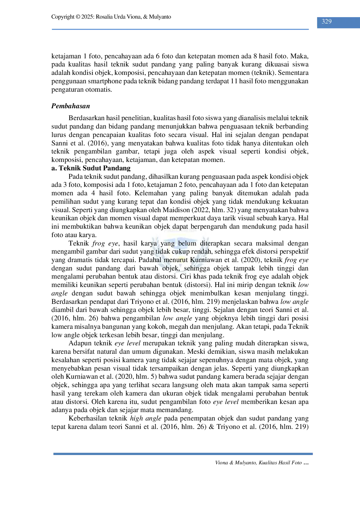 Secara umum, penguasaan teknik sudut pandang dan bidang pandang siswa dalam pembelajaran fotografi tergolong cukup baik.Kualitas hasil foto siswa menunjukkan bahwa mayoritas mampu menghasilkan foto dengan aspek kualitas yang terpenuhi secara optimal.Namun, masih terdapat beberapa kekurangan pada penguasaan teknik, seperti pemilihan sudut yang kurang tepat, pencahayaan yang tidak konsisten, dan kurangnya perhatian pada komposisi serta ekspresi objek.Oleh karena itu, diperlukan peningkatan penguasaan teknik dan aspek visual untuk menghasilkan foto yang lebih optimal.