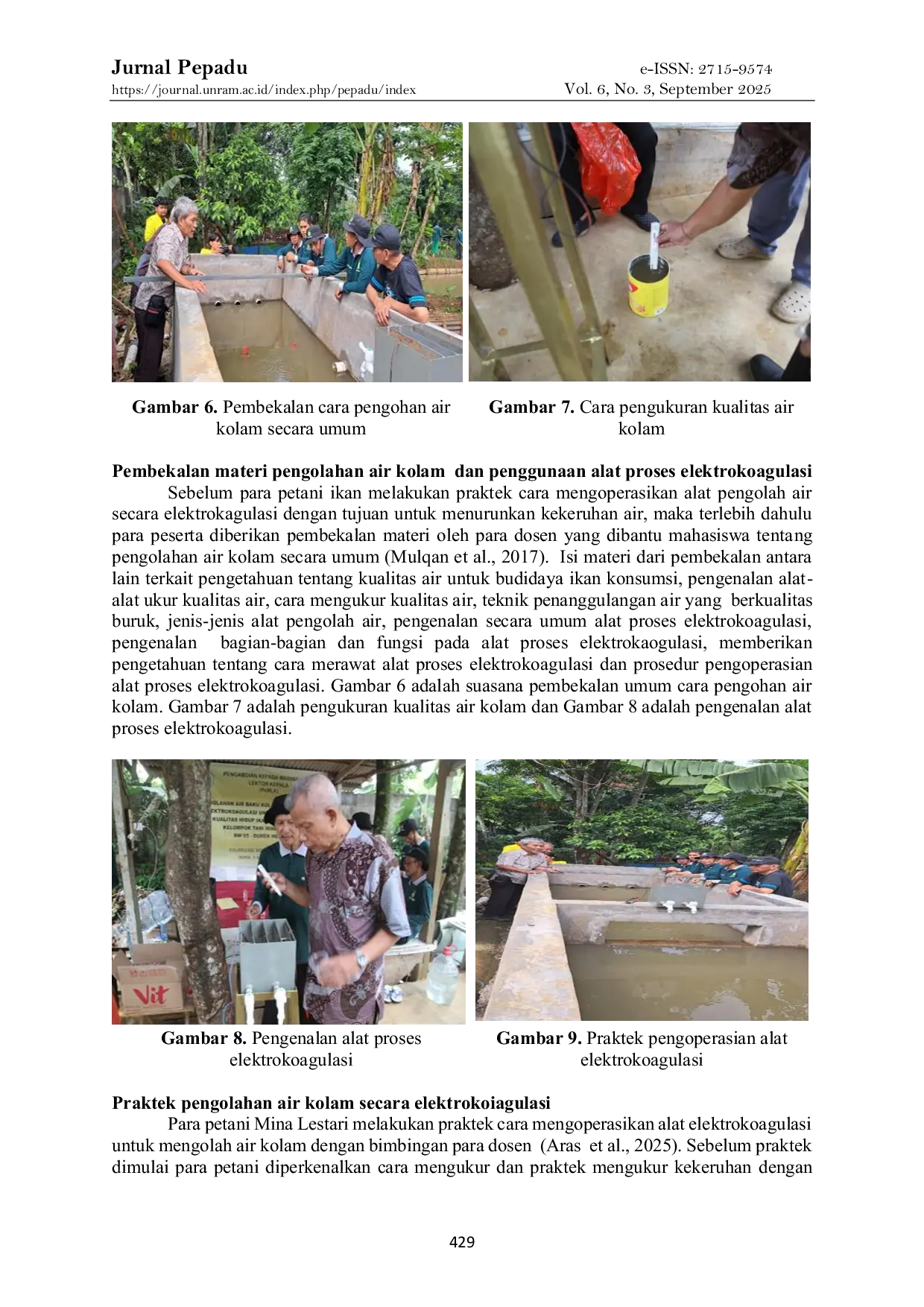 Jurnal PepaduJurnal PepaduAir yang digunakan untuk budidaya ikan gurami oleh kelompok Tani Ikan Mina Lestari kondisinya sangat keruh mencapai 68 NTU, sehingga oksigen terlarut dalam air hanya mencapai 2,5 mg/L. Persyaratan kekeruhan air tertinggi untuk ikan konsumsi adalah 50 NTU dan kadar oksigen terlarut lebih dari 5 mg/L. Dengan demikian banyak ikan mengalami kematian. Metode untuk menurunkan kekeruhan air dilakukan dengan mengolah air secara elektrokoagulasi. Tujuan dari pengabdian kepada masyarakat ini adalah menerapkan proses elektrokoagulasi untuk menurunkan kekeruhan air, sehingga oksigen yang terlarut dalam air semakin meningkat dan menurunkan jumlah kematian ikan gurami di RW 05, Duren Mekar, Depok. Metode yang digunakan adalah survei lokasi, identifikasi masalah, koordinasi mitra, sosialisasi program, pembuatan bak proses elektrokoagulasi, pembuatan pembangkit koagulan, proses elektrokoagulasi, serta evaluasi. Bak proses elektrokoagulasi dibuat dari beton berukuran panjang 3 m, lebar 1,5 m dan tinggi 1,2 m yang dilengkapi satu pipa pralon 4 in untuk saluran air masuk dan tiga pralon 3 in untuk saluran air keluar. Pipa pengeluaran dilengkapi kran pengatur debit air untuk dibagikan ke 15 kolam. Proses elektrokoagulasi dilakukan dengan mengalirkan cairan koagulan 5 liter per menit dari bak pembangkit koagulan menuju bak proses elektrokoagulasi yang dialiri air. Proses elektrokoagasi mampu menurunkan kekeruhan air dari 68 NTU menjadi 43 NTU dan meningkatkan oksigen terlarut dari 2,5 mg/L menjadi 5,6 mg/L serta menurunkan jumlah kematian ikan gurami dari 20 ekor menjadi 5 ekor dari budidaya 100 ekor ikan selama 5 bulan. Kesimpulan proses elektrokoagulasi air kolam mampu menghasilkan air dengan kekeruhan yang memenuhi syarat untuk budidaya ikan gurami.