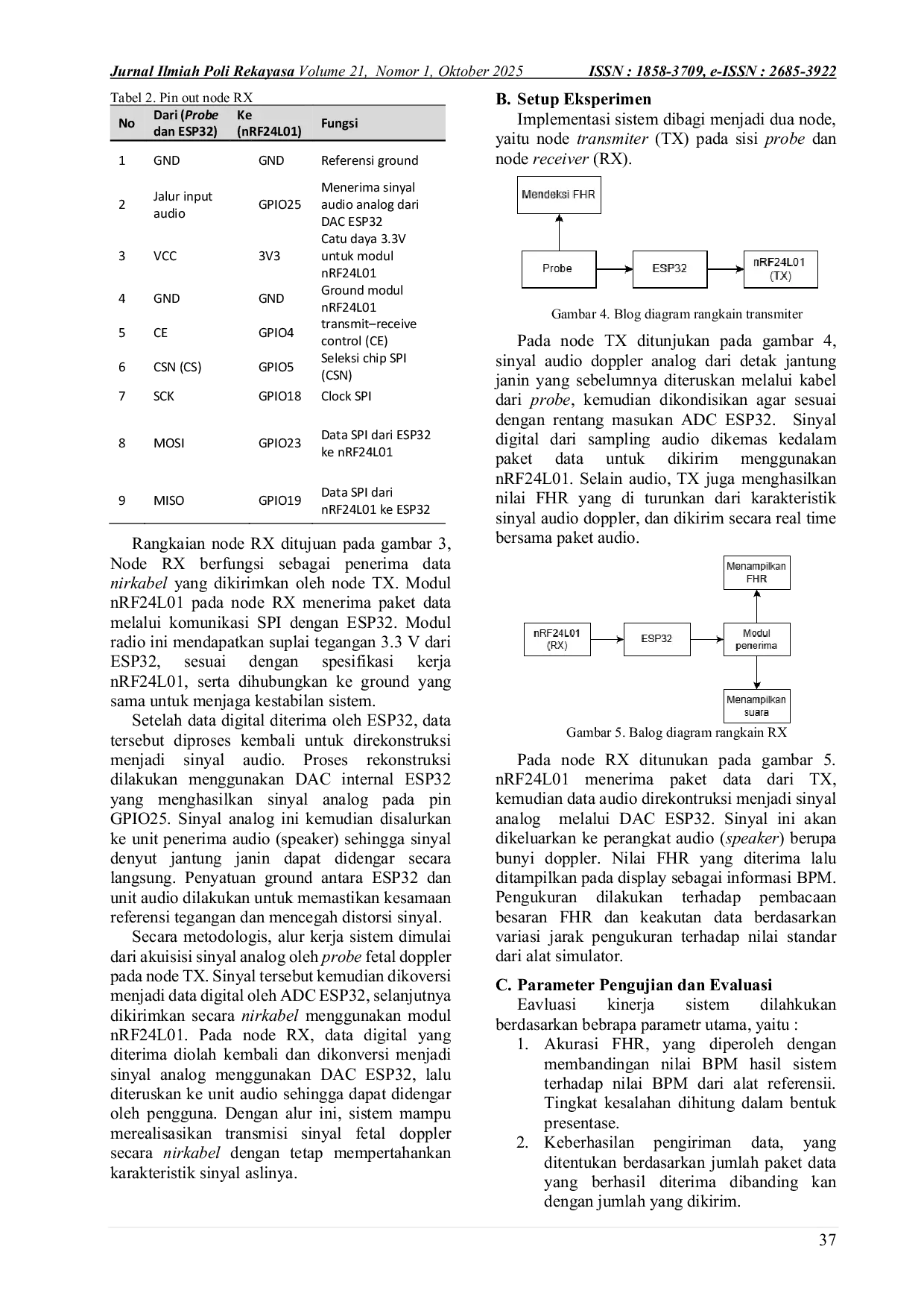 Jurnal Ilmiah Poli RekayasaJurnal Ilmiah Poli RekayasaFetal doppler merupakan perangkat penting untuk memantau detak jantung janin (FHR) sebagai indikator awal kondisi kehamilan. Namun, perangkat fetal doppler konvensional masih bergantung pada kabel antara probe dan unit utama, yang membatasi pergerakan, mengurangi kenyamanan ibu hamil, serta meningkatkan risiko kerusakan kabel. Penelitian ini bertujuan merancang dan membangun modul fetal doppler nirkabel berbasis ESP32 dan nRF24L01 pada perangkat Taff Omicron JLS-T501 untuk transmisi nirkabel sinyal audio doppler dan nilai FHR. Sistem yang dikembangkan terdiri dari modul pemancar di sisi probe yang melakukan akuisisi, pengkondisian, dan digitalisasi sinyal audio doppler, lalu mengirimkan data melalui modul nRF24L01. Modul penerima berbasis ESP32 melakukan rekonstruksi sinyal audio dan menghitung FHR secara digital. Pengujian dilakukan menggunakan simulator detak jantung janin pada beberapa kategori BPM dengan variasi jarak transmisi 20–120 cm untuk mengevaluasi akurasi FHR, kualitas audio, dan keandalan komunikasi. Hasil pengujian menunjukkan kesalahan pembacaan FHR berada pada kisaran 1–2% dari nilai referensi, dengan kualitas audio tetap jernih hingga jarak 200 cm tanpa gangguan signifikan. Hasil ini menunjukkan bahwa integrasi modul nirkabel ke dalam fetal doppler JLS-T501 dapat meningkatkan fleksibilitas dan kenyamanan penggunaan tanpa mengorbankan akurasi pengukuran dan kualitas sinyal.