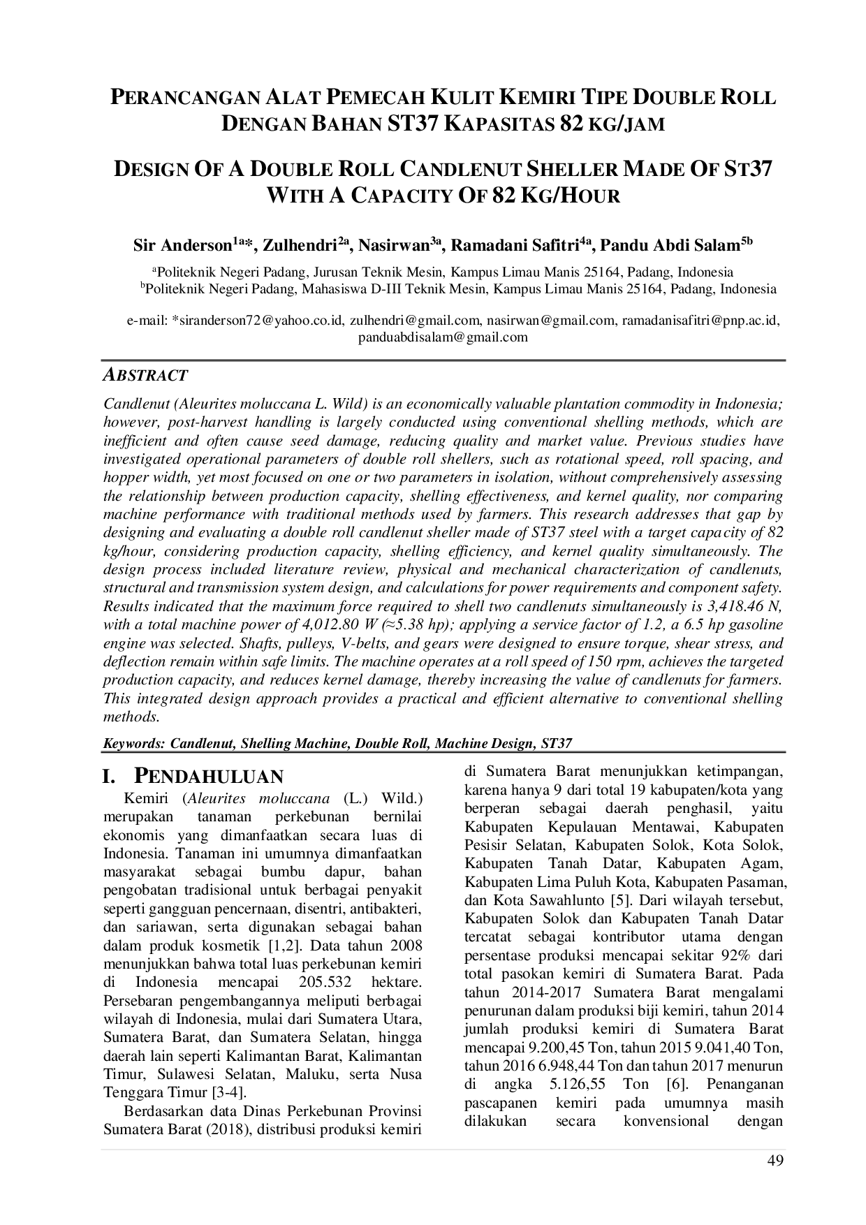 Jurnal Ilmiah Poli RekayasaJurnal Ilmiah Poli RekayasaCandlenut (Aleurites moluccana L. Wild) is an economically valuable plantation commodity in Indonesia; however, post-harvest handling is largely conducted using conventional shelling methods, which are inefficient and often cause seed damage, reducing quality and market value. Previous studies have investigated operational parameters of double roll shellers, such as rotational speed, roll spacing, and hopper width, yet most focused on one or two parameters in isolation, without comprehensively assessing the relationship between production capacity, shelling effectiveness, and kernel quality, nor comparing machine performance with traditional methods used by farmers. This research addresses that gap by designing and evaluating a double roll candlenut sheller made of ST37 steel with a target capacity of 82 kg/hour, considering production capacity, shelling efficiency, and kernel quality simultaneously. The design process included literature review, physical and mechanical characterization of candlenuts, structural and transmission system design, and calculations for power requirements and component safety. Results indicated that the maximum force required to shell two candlenuts simultaneously is 3,418.46 N, with a total machine power of 4,012.80 W (≈5.38 hp); applying a service factor of 1.2, a 6.5 hp gasoline engine was selected. Shafts, pulleys, V-belts, and gears were designed to ensure torque, shear stress, and deflection remain within safe limits. The machine operates at a roll speed of 150 rpm, achieves the targeted production capacity, and reduces kernel damage, thereby increasing the value of candlenuts for farmers. This integrated design approach provides a practical and efficient alternative to conventional shelling methods.
