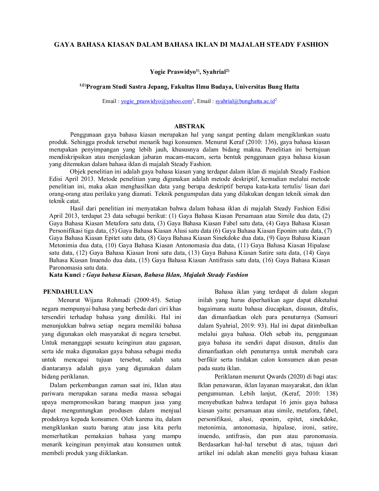 Abstract of Undergraduate Research, Faculty of Humanities, Bung Hatta UniversityAbstract of Undergraduate Research, Faculty of Humanities, Bung Hatta UniversityPenggunaan gaya bahasa kiasan merupakan hal yang sangat penting dalam mengiklankan suatu produk, sehingga produk tersebut menarik bagi konsumen. Penelitian ini bertujuan mendiskripsikan atau menjelaskan jabaran macam-macam, serta bentuk penggunaan gaya bahasa kiasan yang ditemukan dalam bahasa iklan di majalah Steady Fashion. Objek penelitian ini adalah gaya bahasa kiasan yang terdapat dalam iklan di majalah Steady Fashion Edisi April 2013. Metode penelitian yang digunakan adalah metode deskriptif. Hasil dari penelitian ini menyatakan bahwa dalam bahasa iklan di majalah Steady Fashion Edisi April 2013, terdapat 23 data gaya bahasa kiasan, meliputi simile, metafora, fabel, personifikasi, alusi, eponim, epitet, sinekdoke, metonimia, antonomasia, hipalase, ironi, satire, inuendo, antifrasis, dan paronomasia.