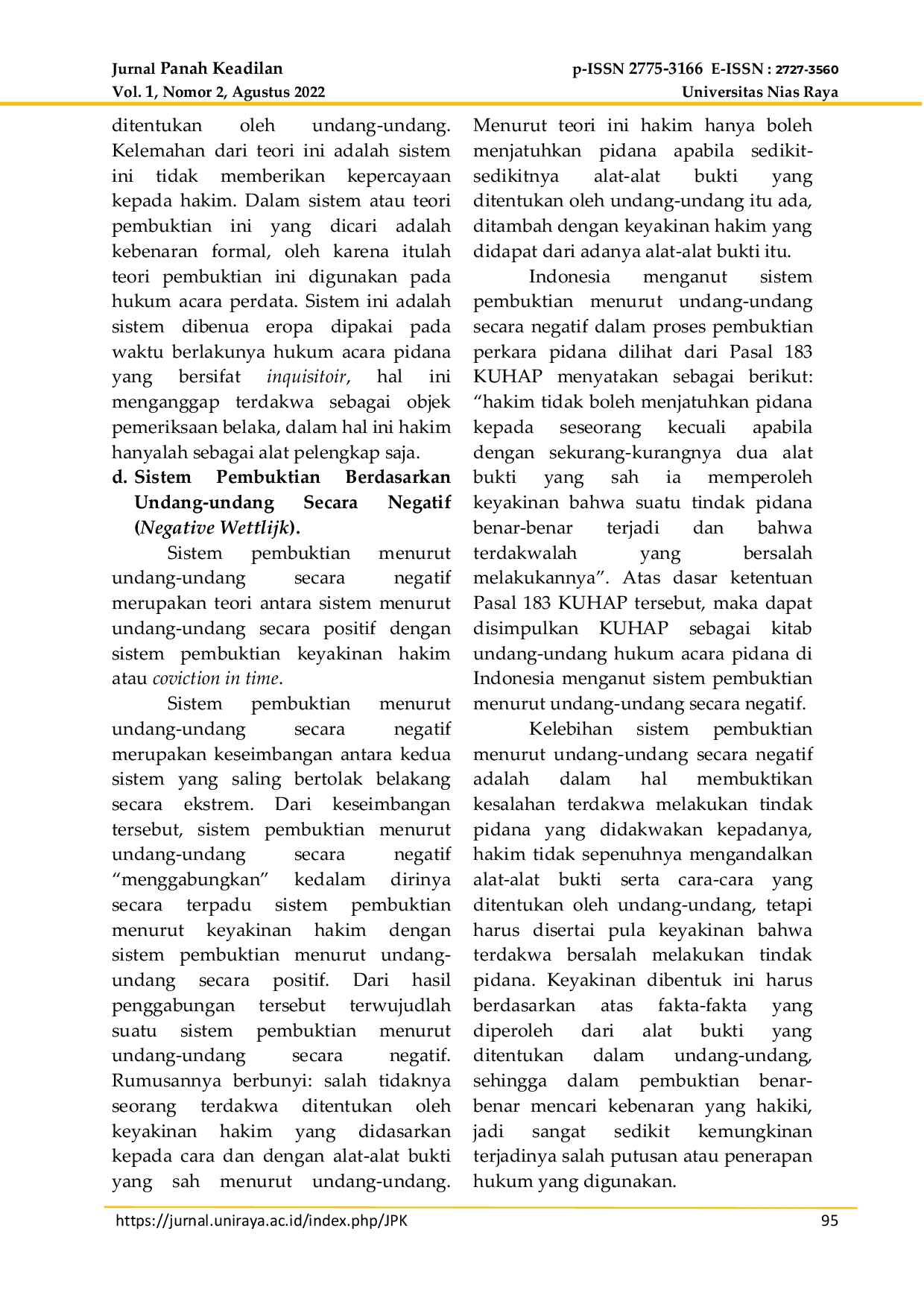 JURNAL PANAH KEADILANJURNAL PANAH KEADILANMasalah hukum adalah masalah pembuktian di pengadilan tentang siapa yang bersalah, oleh karena itu peran dari pembuktian dalam suatu proses hukum di pengadilan sangatlah penting. Penelitian ini bertujuan untuk mengetahui bagaimana suatu perbuatan dapat dinyatakan percobaan pembunuhan sesuai Pasal 338 jo Pasal 53 KUHP dan untuk mengetahui tentang perkara percobaan pembunuhan telah sesuai dengan Pasal 338 jo Pasal 53 KUHP. Metode penelitian yang digunakan adalah metode penelitian yuridis normatif dengan menggunakan metode pendekatan peraturan perundang-undangan dan metode pendekatan kasus.