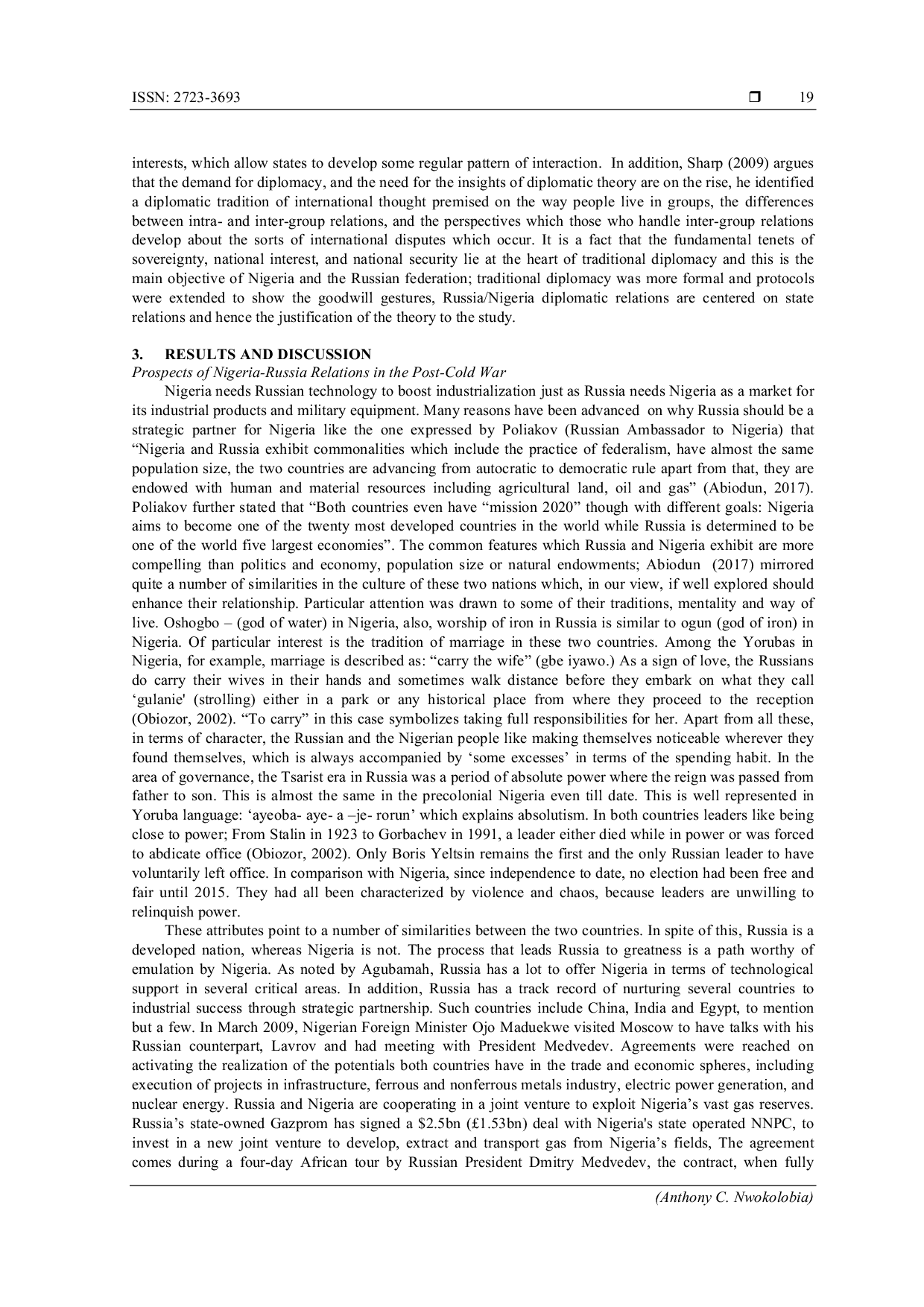 Indonesian Journal of Education, Social Sciences and Research (IJESSR)Indonesian Journal of Education, Social Sciences and Research (IJESSR)Setelah perpecahan Uni Soviet, Rusia mengejar kebijakan luar negeri yang sulit dalam hubungannya dengan negara-negara Afrika dengan memanfaatkan jaringan dan kemitraan yang terbentuk selama Perang Dingin. Rusia telah meninggalkan promosi sosialisme dan beralih ke kepentingan ekonomi melalui elite bisnisnya, berdasarkan nilai-nilai yang kontras dengan liberalisme Barat. Hubungan bilateral Nigeria-Rusia di era pasca-Perang Dingin mengalami pengalaman yang campur aduk. Studi ini merupakan penilaian terhadap ikatan ekonomi Nigeria dan Rusia dari sudut pandang historis dengan menggunakan teori diplomasi tradisional untuk melacak hubungan diplomatik yang ada antara kedua negara. Kesimpulannya, hubungan Nigeria-Rusia telah matang, meskipun ada perbedaan psikologis dan kecurigaan, banyak keuntungan yang diperoleh, namun masih diperlukan upaya lebih dalam pertukaran media dan budaya serta kebijakan perdagangan yang menguntungkan ekspor Nigeria. Disarankan agar hubungan ekonomi kedua negara diperkuat dengan lebih menekankan kerja sama di tingkat usaha kecil dan menengah.