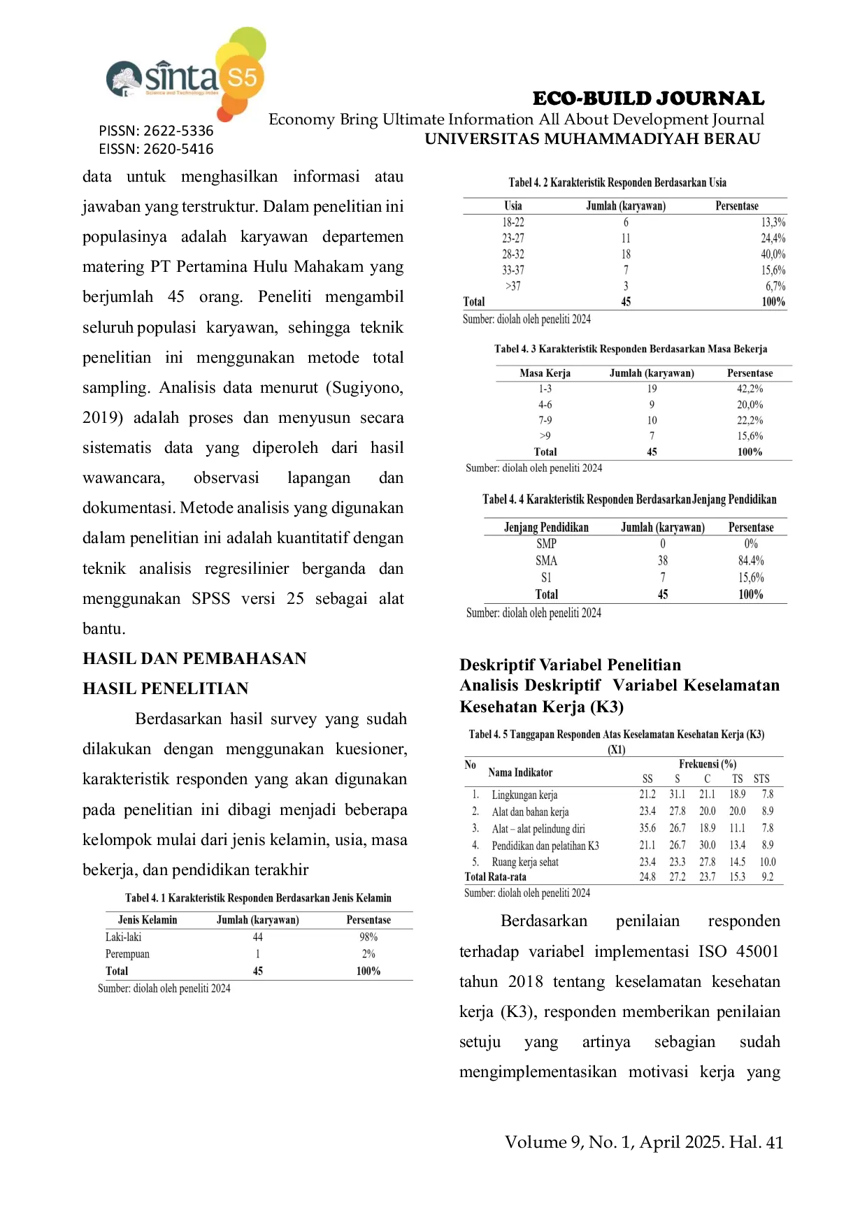 ECO-BUILD; Economy Bring Ultimate Information All About Development JournalECO-BUILD; Economy Bring Ultimate Information All About Development JournalKinerja merupakan hasil yang dicapai seseorang, banyak hal yang mampu mempengaruhi kinerja diantaranya adalah Implementasi ISO 45001 tahun 2018 tentang keselamatan kesehatan kerja (K3) dan beban kerja. Penelitian ini bertujuan untuk menggambarkan adanya keterikatan antara keselamatan kesehatan kerja (K3), beban kerja dan kinerja karyawan di departemen metering di PT Pertamina Hulu Mahakam. Penelitian ini menggunakan kuantitataif dengan pendekatan deskriptif, dan teknik sampel yaitu total sampling dengan populasi seluruh karyawan departemen metering sejumlah 45 karyawan. Metode analisis yang digunakan adalah analisis linier berganda, uji asumsi klasik, dan uji hipotesis dengan alat bantu SPSS 26. Hasil penelitian ini adalah untuk menjawab seluruh hipotesis pada penelitian ini, yaitu pengaruh keselamatan kesehatan kerja (K3) terhadap kinerja karyawan, beban kerja terhadap kinerja karyawan, dan keselamatan kesehatan kerja (K3) dan beban kerja terhadap kinerja karyawan pada departemen metering.