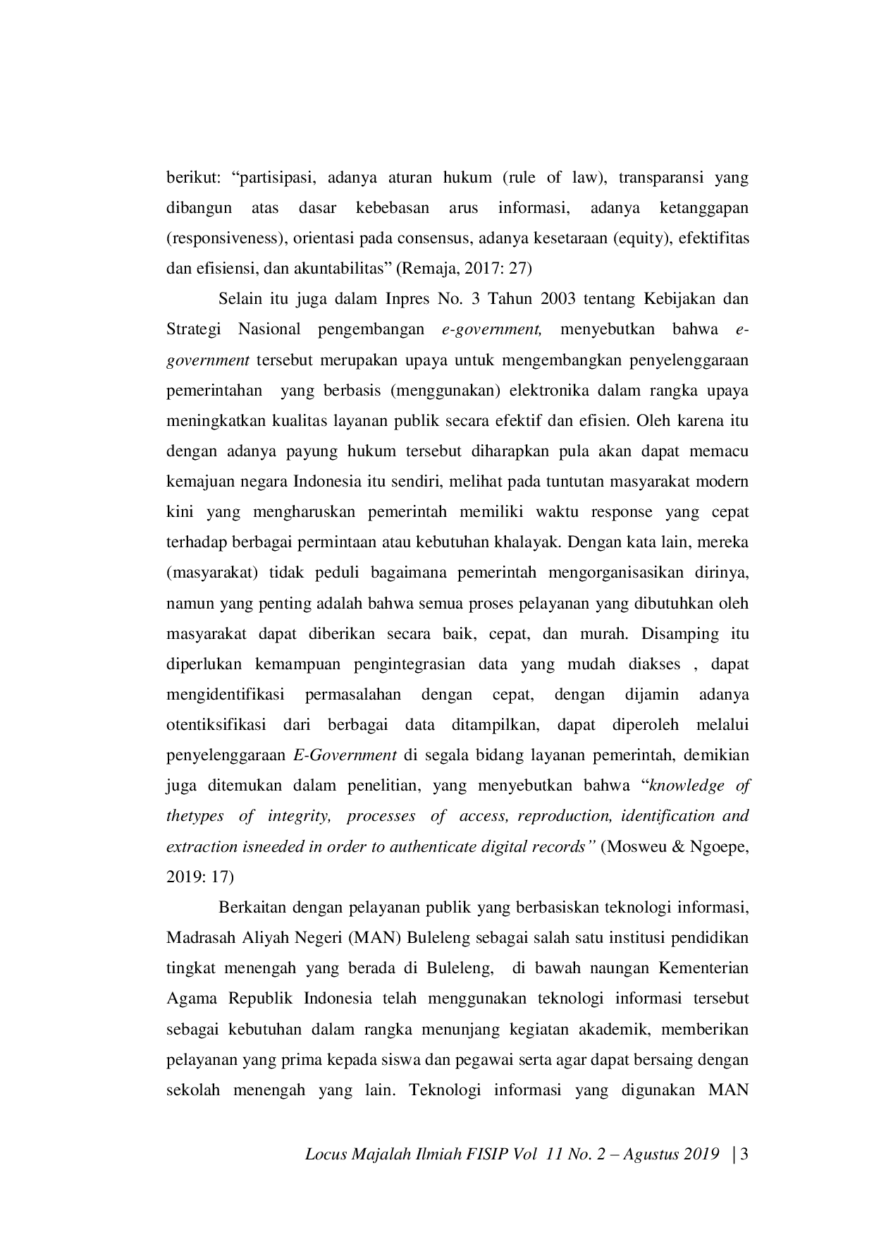 LocusLocusPenelitian ini dilatarbelakangi oleh pemahaman peneliti bahwa Madrasah Aliyah Negeri (MAN) Buleleng merupakan satu-satunya Madrasah Negeri yang berada di Buleleng dibawah naungan Kantor Kementerian Agama Republik Indonesia, dan sudah sepatutnya menyelenggarakan pelayanan berbasis E-Government sebagai media dalam mewujudkan pelayanan yang maksimal, efektif dan efisien. Peneliti mengemukakan bahwa penerapan E-Government di MAN Buleleng sudah berjalan dengan baik meskipun masih memiliki kekurangan hal ini dapat terlihat dari infrastruktur sumberdaya manusia yang masih belum memenuhi standar atau kualifikasi dalam penerapan E-Government. Secara umum, penelitian ini bertujuan untuk mendeskripsikan tentang penerapan E-Government dan faktor-faktor pendukung dan penghambat dalam penerapan E-Government Dalam Meningkatkan Pelayanan Pendidikan Di Madrasah Aliyah Negeri (MAN) Buleleng. Penelitian ini menggunakan tipe penelitian deskriptif kualitatif. Fokus penelitiannya adalah tentang penerapan E-Government serta 6 indikator penerapan E-Government yakni Infrastruktur Data, Infrastruktur Manusia, Infrastruktur Legal, Infrastruktur Teknologi dan Strategi Pemimpin. Instrumen pengumpulan datanya menggunakan teknik wawancara dan observasi secara langsung pada lokasi serta berdasarkan dokumen-dokumen yang berkaitan dengan fokus penelitian, lama peneltiannya adalah sekitar 2 bulan, dan teknik analisis data dalam penelitian ini dilakukan secara kualitatif. Hasil penelitian ini menunjukkan bahwa sudah terdapat penerapan berbasis E-Government di Madrasah Aliyah Negeri (MAN) Buleleng yakni penerapan Layanan Pengadaan Secara Elektronik (LPSE) dan Sistem Informasi Manajemen Kepegawaian (SIMPEG). Secara umum, penerapan berbasis E-Government ini telah berjalan dengan optimal, namun masih terdapat beberapa kekurangan dalam penerapannya seperti adanya perangkapan tugas bagi staff yang bertugas mengelola LPSE dan SIMPEG.