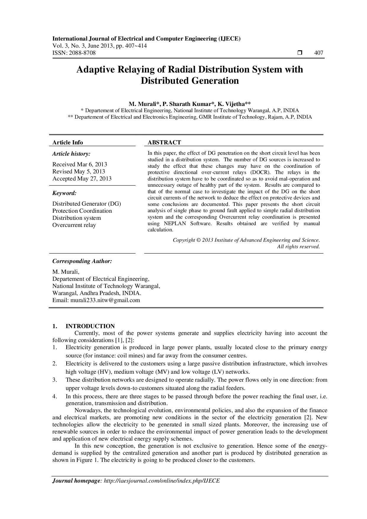 International Journal of Electrical and Computer Engineering (IJECE)International Journal of Electrical and Computer Engineering (IJECE)Dalam makalah ini, efek penetrasi DG terhadap tingkat arus pendek telah diteliti dalam sistem distribusi. Jumlah sumber DG ditingkatkan untuk mempelajari efek perubahan ini terhadap koordinasi relay over-current arah protektif (DOCR). Relay dalam sistem distribusi harus dikoordinasikan agar tidak terjadi maloperasi dan pemadaman tidak perlu dari bagian sehat sistem. Hasilnya dibandingkan dengan kasus normal untuk menyelidiki dampak DG pada arus pendek jaringan untuk menyimpulkan efek pada perangkat pelindung dan beberapa kesimpulan didokumentasikan. Makalah ini menyajikan analisis arus pendek kesalahan satu fase ke tanah yang diterapkan pada sistem distribusi radial sederhana dan koordinasi relay overcurrent yang sesuai disajikan menggunakan Perangkat Lunak NEPLAN. Hasil yang diperoleh diverifikasi dengan perhitungan manual.