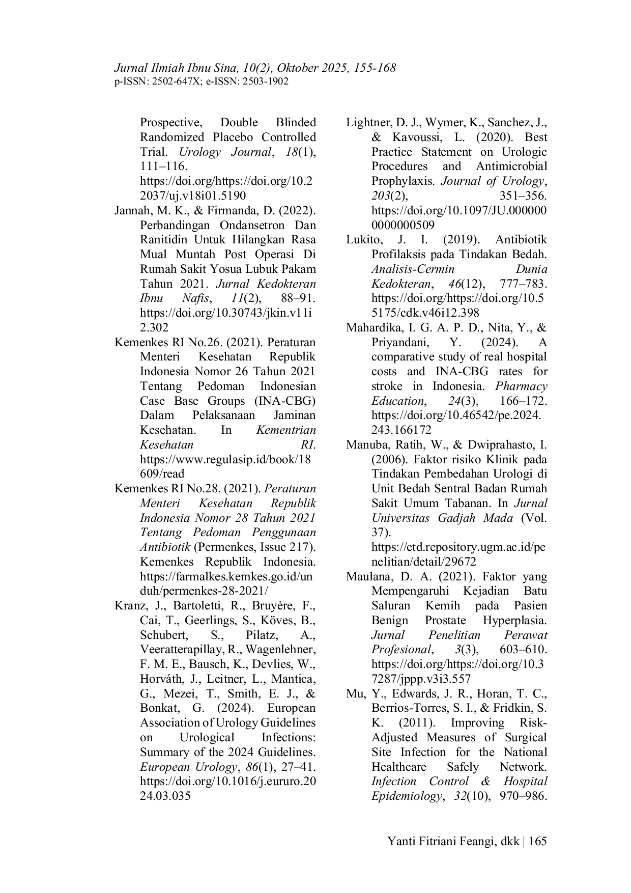 JIIS (Jurnal Ilmiah Ibnu Sina): Ilmu Farmasi dan KesehatanJIIS (Jurnal Ilmiah Ibnu Sina): Ilmu Farmasi dan KesehatanProsedur bedah urologi, seperti urolitiasis dan benign prostatic hyperplasia (BPH), terus meningkat dengan tingkat kekambuhan yang tinggi. Fasilitas penanganan yang terbatas dan risiko resistensi antibiotik dapat mempengaruhi beban biaya. Studi ini bertujuan untuk mengetahui kesesuaian biaya medis langsung dengan tarif klaim INA-CBGs, serta mengidentifikasi variabel yang mempengaruhi total biaya medis langsung. Studi ini menggunakan studi observasional dengan pendekatan retrospektif. Sampel dipilih menggunakan purposive sampling dengan kriteria inklusi. Data dikumpulkan dari elektronik rekam medis dan laporan keuangan. Biaya medis langsung dihitung berdasarkan semua komponen biaya menggunakan pendekatan perspektif rumah sakit. Analisis data menggunakan uji univariat, bivariat, dan multivariat. Rata-rata total biaya medis langsung pasien urologi sebesar Rp 9.962.325 ± Rp 1.699.707,79, sedangkan tarif klaim INA-CBGs sebesar Rp 9.600.328 ± Rp 1.853.291,26. Ada perbedaan biaya medis langsung dari faktor usia (p-value 0.024), kelas perawatan (p-value 0,035) dan length of stay (LOS) (p-value 0,000). Analisis regresi menunjukkan bahwa LOS dan kelas perawatan memiliki dampak yang signifikan secara statistik terhadap total biaya medis langsung (p-value < 0.05). Terdapat perbedaan antara biaya aktual yang ditanggung rumah sakit dan tarif klaim INA-CBGs.