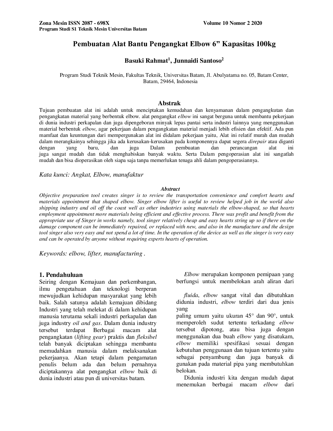 Zona Mesin: Program Studi Teknik Mesin Universitas BatamZona Mesin: Program Studi Teknik Mesin Universitas BatamTujuan pembuatan alat ini adalah untuk menciptakan kemudahan dan kenyamanan dalam pengangkutan dan pengangkatan material yang berbentuk elbow. Alat pengangkat elbow ini sangat berguna untuk membantu pekerjaan di dunia industri perkapalan dan juga dipengeboran minyak lepas pantai serta industri lainnya yang menggunakan material berbentuk elbow, agar pekerjaan dalam pengangkatan material menjadi lebih efisien dan efektif. Ada pun mamfaat dan keuntungan dari mempergunakan alat ini didalam pekerjaan yaitu, Alat ini relatif murah dan mudah dalam merangkainya sehingga jika ada kerusakan-kerusakan pada komponennya dapat segera direpair atau diganti dengan ini juga sangat mudah dan tidak menghabiskan banyak waktu. Serta Dalam pengoperasian alat ini sangatlah mudah dan bisa dioperasikan oleh siapa saja tanpa memerlukan tenaga ahli dalam pengoperasiannya.